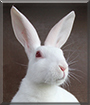 Dearest Ghost, also known as Ghastly Love Bites, you are such a beautiful young albino lady! You're absolutely stunning, sitting up there so proudly with that white fur that looks so soft and that sweet face with those lovely big red eyes and the cute pink nose and ears. And what a terrific story you have to tell! Your birth-mom pushed you out of the nest when you were just four days old. Her breeder-mom was unable to care for you, but fortunately and blessedly for you both, she knew just the right person to call upon! That was her breeder friend, who has brought you up with a bottle and has you sleep with the family's Chihuahua for warmth. Now, four months and 1.8 pounds later, you're still small but you're growing up nicely! You love playing with your Chi and Rottie and baby-bunny housemates. You're very caring and have a heart of gold. Your dear person is looking forward to watching you grow! You and your dear family members, all species, all love each other very much, don't you. What a wonderful love-filled home you share!