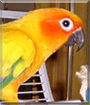 Dearest Snickers, you are absolutely gorgeous! What a stunning beauty of a Sun Conure you are, with those brilliantly-colorful feathers and that sweet face with the lovely big dark eyes. You have the most delightful personality, too! You bring great joy to the lives of your dear people. When they come home, you squawk and squawk for them to let you out! You enjoy playing tag and hiding in the hanging blinds. You also love to get baths and eat with your people. When you're happy, you make cute, funny, little clucks and sometimes a purr noise! You love to snuggle and to have your tummy rubbed. You even help with the laundry! You and your people all love each other very much, don't you. What a wonderful love-filled home you share!