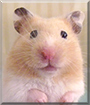 Dearest Crumpet, what an utterly adorable Syrian Hamster you are! You're so beautiful, with that soft-looking gold and white fur, those cute little pink paws, and that sweet face with the little pink nose, long whiskers going out all around, and lovely big dark eyes. You're very talented, too. Your dear person once saw you do a backflip! You're very strong, and you rearrange things in your cage to get your interior decoration just right. Your person says you're "pretty, kinda smart and a fun pet." You love each other very much, don't you. What a wonderful love-filled home you share!