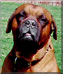Dearest Bruits, you are a marvelous Dogue du Bordeaux! You're so handsome, sitting up so proudly and nobly in that grassy field. That brown fur is gorgeous, and you have the sweetest face with those lovely big dark eyes and that mouth with the big contented grin, complete with white toofies! You're a big dog, and your deep, loud bark can sound quite scary to people who don't know you! You rarely feel the need to bark, though, because you're really a big softie. You love milk bones and getting your butt scratched in that special spot right above your tail! You and your dear people all love each other very much, don't you. What a wonderful love-filled home you share!
