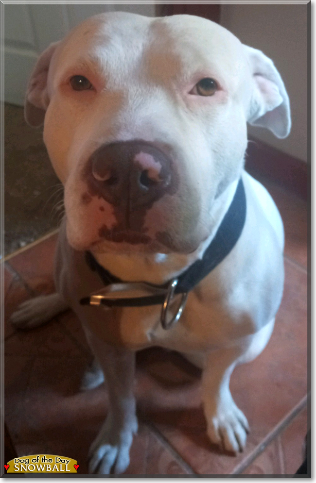 Dearest Snowball, what a beautiful Dogo Argentino you are! And what an important role you play in the life of your dear person, as her/his service dog! You have the most delightful personality! You're the kindest dog with everyone you meet, a gentle giant who'd rather lay on your back for hours of belly rubs than play. You're very affectionate, and you love children. You're the sweetest, most precious companion of your person, who hopes (as do we) that you two share your average total fifteen years, if not many, many more, together! She/he gives you the best of everything, and you deserve it. You're one in a million, and you two love each other very much, don't you. What a wonderful love-filled home you share!