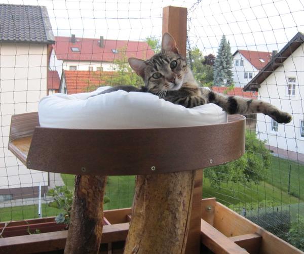 Kiri and Orion got a new outdoor cat tree for the balcony. It is made from a tree felled by a beaver and has 3 levels. (Of course we had it made- both of us are sooo stupid in fixing things.) It didn’t take them long to love it because it is such a wonderful place for birdwatching: