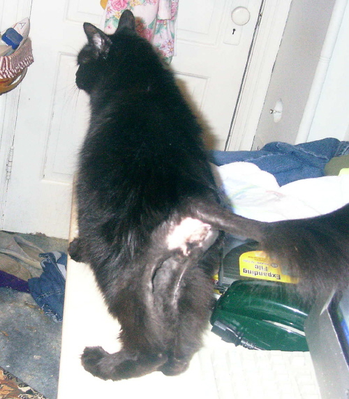 Poor boy! But tell him he looks adoreable in his diaper and the color shows his beautiful black fur to be as black and sleek as it really is.