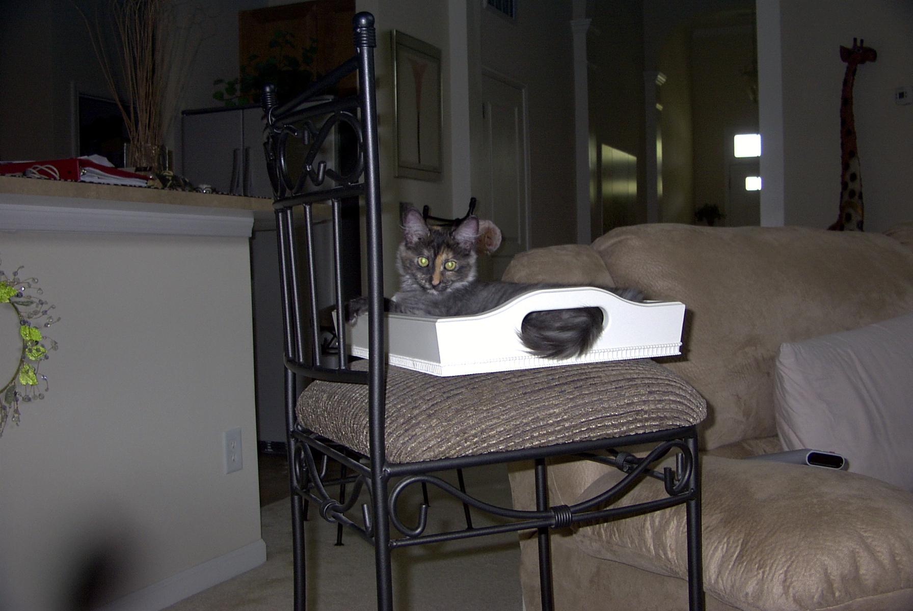 One thing I have heard of for counters and such, is to put a few nice strips of double-faced tape in 'popular' areas of the counter- cats HATE the feeling of walking on sticky stuff like tape, and perhaps a few days of that will do away with the huge desire to spend time up there! Sounds like the tortie is doing her best to 'train' the human in this case, and that the tortie is 'winning'-- which might be bad for her, if people are contemplating giving her up. Smarter cats (and I certainly include Torties) can definitely get into 'battles of wits' with their humans on topics like this and they can be stubborn as hell- good luck!!