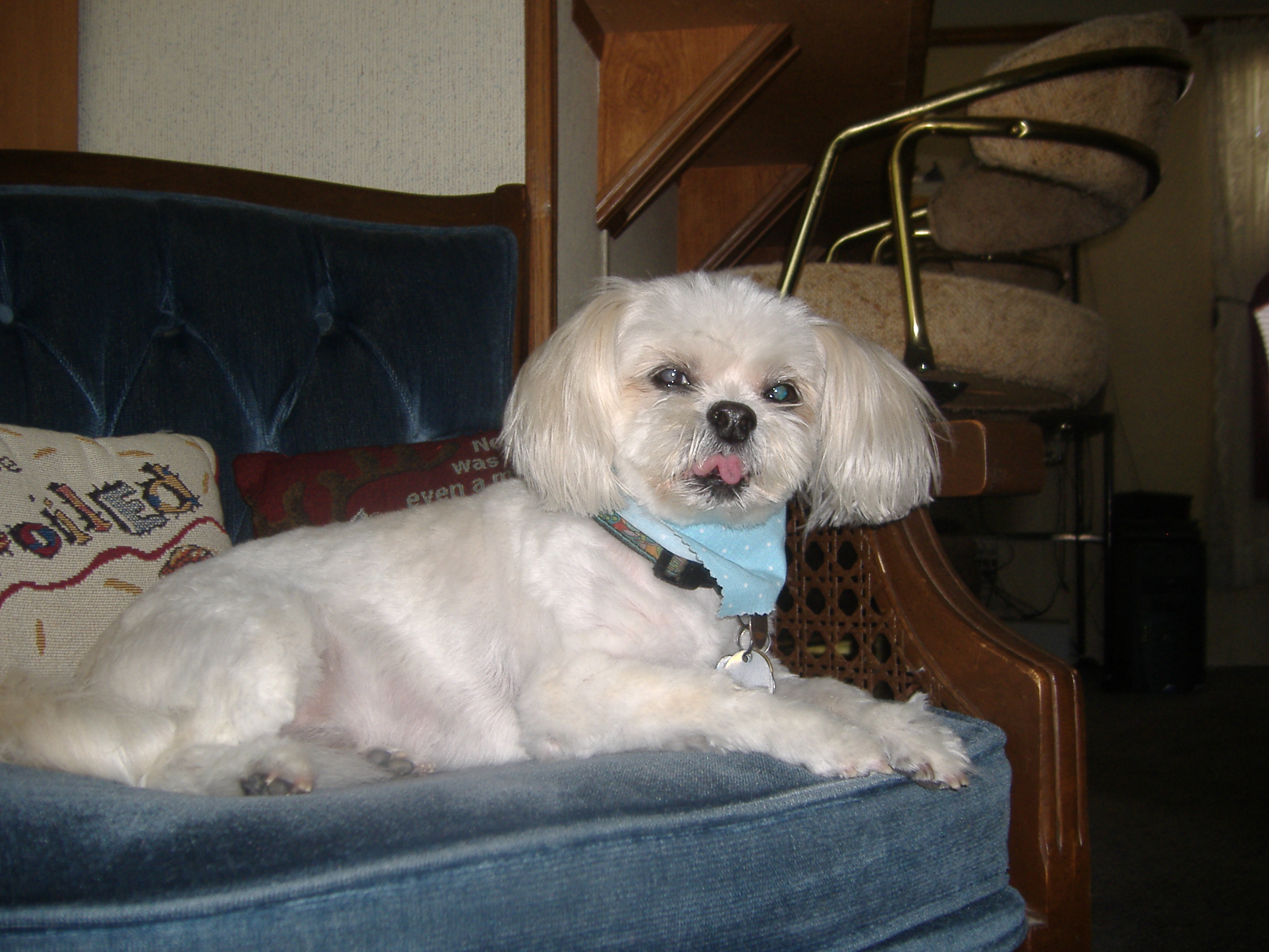 With his new groomer! Yup - I finally made the change. A couple of years ago I was having groomer woes, and checked out the mobile groomer in town, but I really couldn't afford the extra expense since at the time, I was taking both of the Fuzzbuttz to be groomed. Since then, I have stopped taking Myndi and I do her myself, since she is getting too old and it was too stressful for her, and she is easy to do, since she doesn't get her hair cut. But Sparky continued to go, even tho he did not like to, and he was getting to where he would stress every time I took him too.