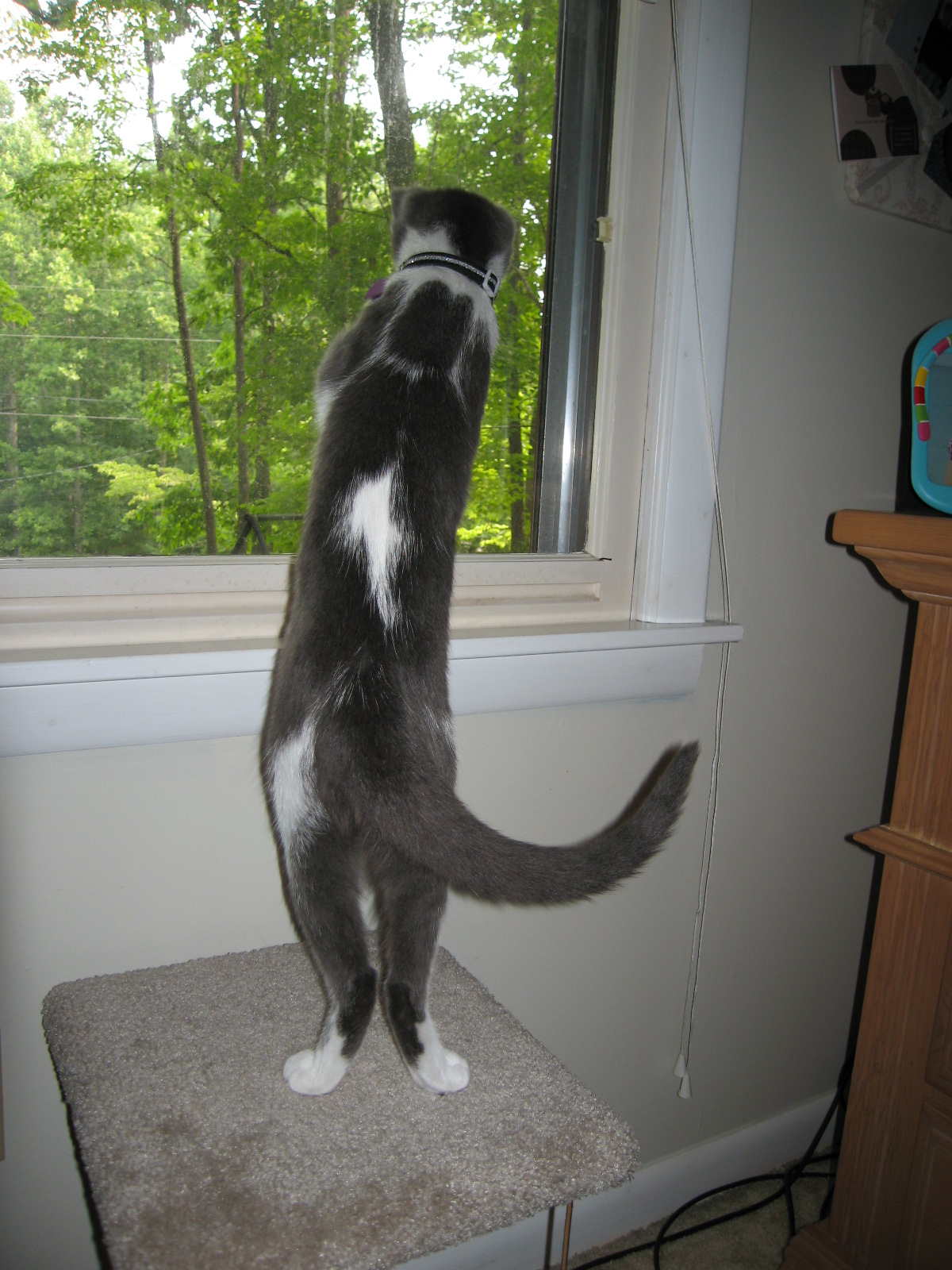 Here are some pics of Jenna looking out the window this morning. She spotted a turtle creeping around outside. She was about to jump through the window lol.