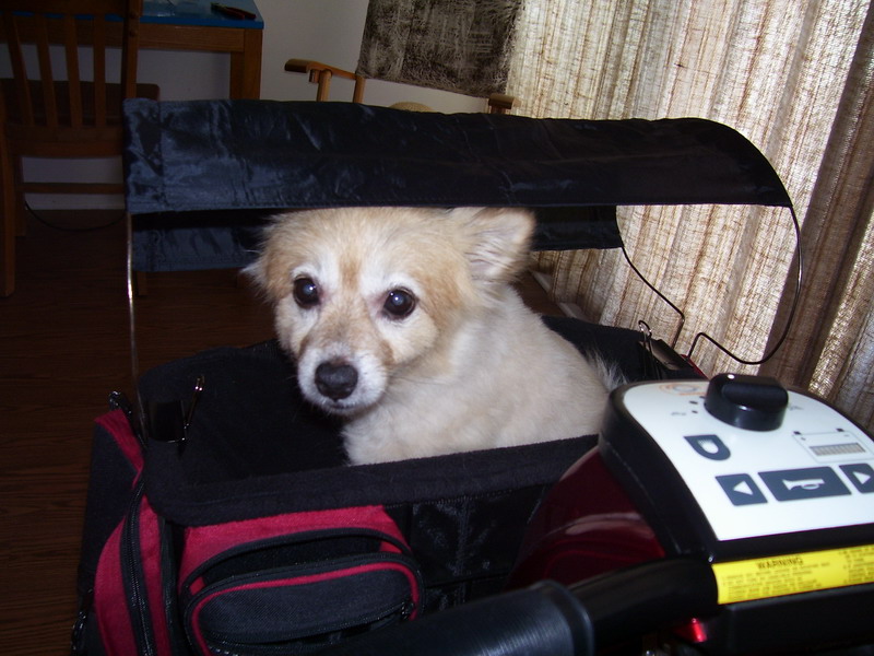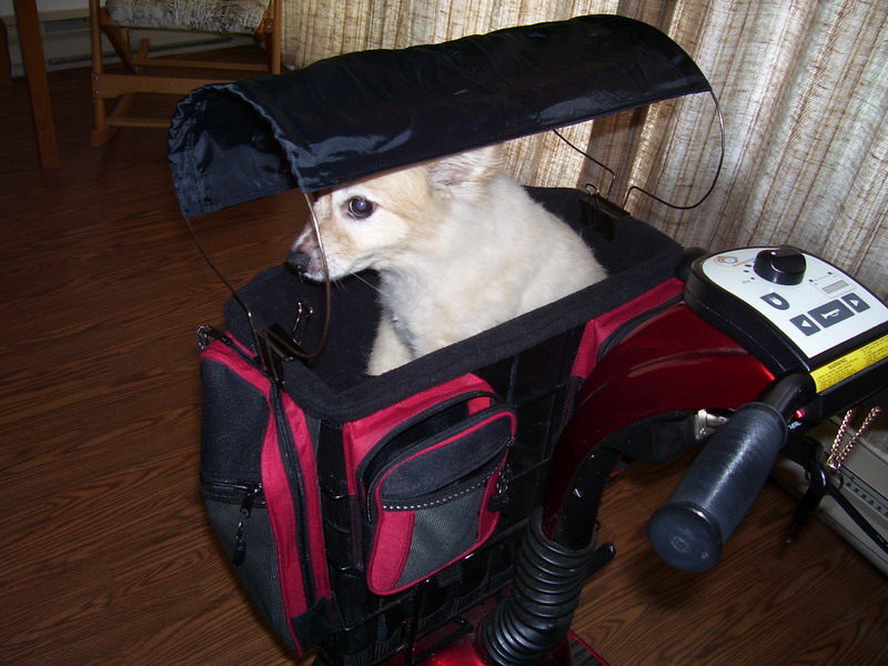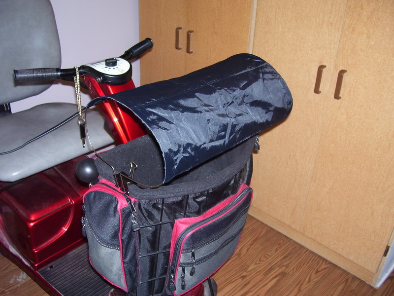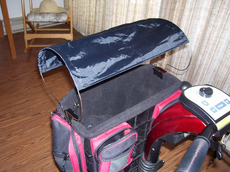 Here are pictures I just took of my invention to protect Cokette. As you see Cokette just fits ok in it. And she seems to be at ease with it. The Parasol is low enough that it wont obstruct my driving view. I made it with 2 clamps, 2 coat hangers and an old piece of cloth. For storage it fits perfectly in the front pouch seen in photo 5.