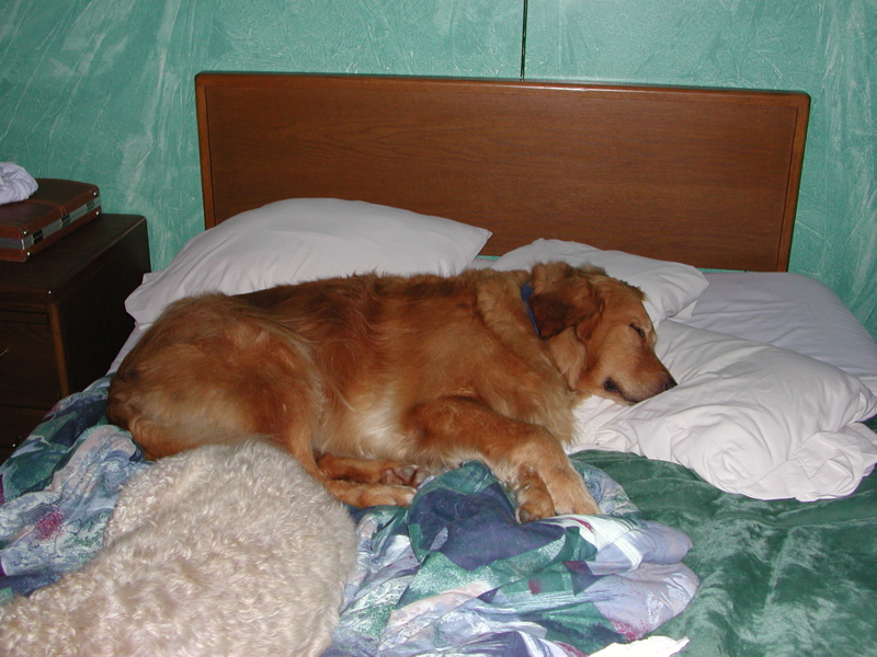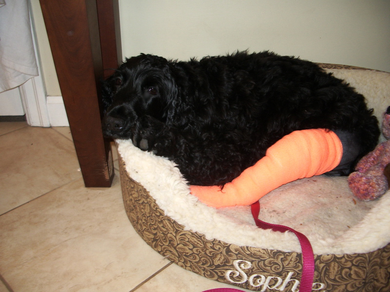 2 picts of my big boy Jake (golden retriever)--carrying a "BIG STICK", his favorite kind, and tired boy resting (with RB wheaton, Clancy). 2 more of little girl Sophie (english cocker spaniel), one just looking cute, and one with her cast when she had her patella luxation surgery (she is doing great now, in "rehab").