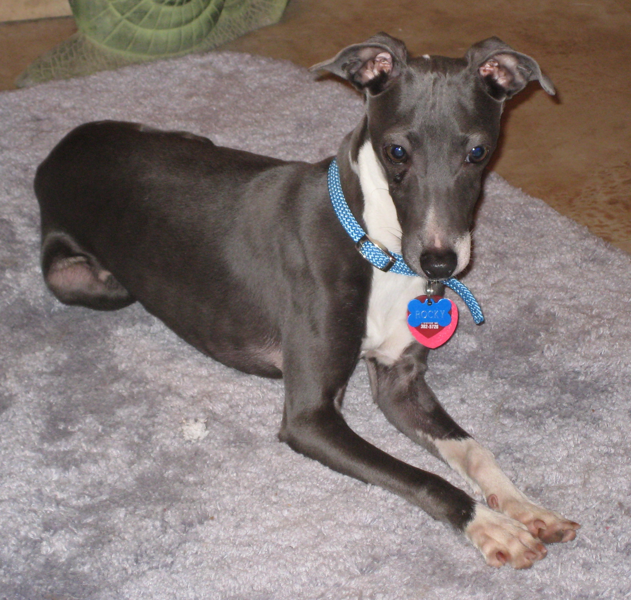 So ... without further ado .... meet Rocky! He is the poster child for the "No Puppy Mill/Pet Store Puppies!" campaign, with his buck teeth and crooked tail. Poor guy. He is also morbidly afraid of men, completely not house trained at seven months old, and was intact.