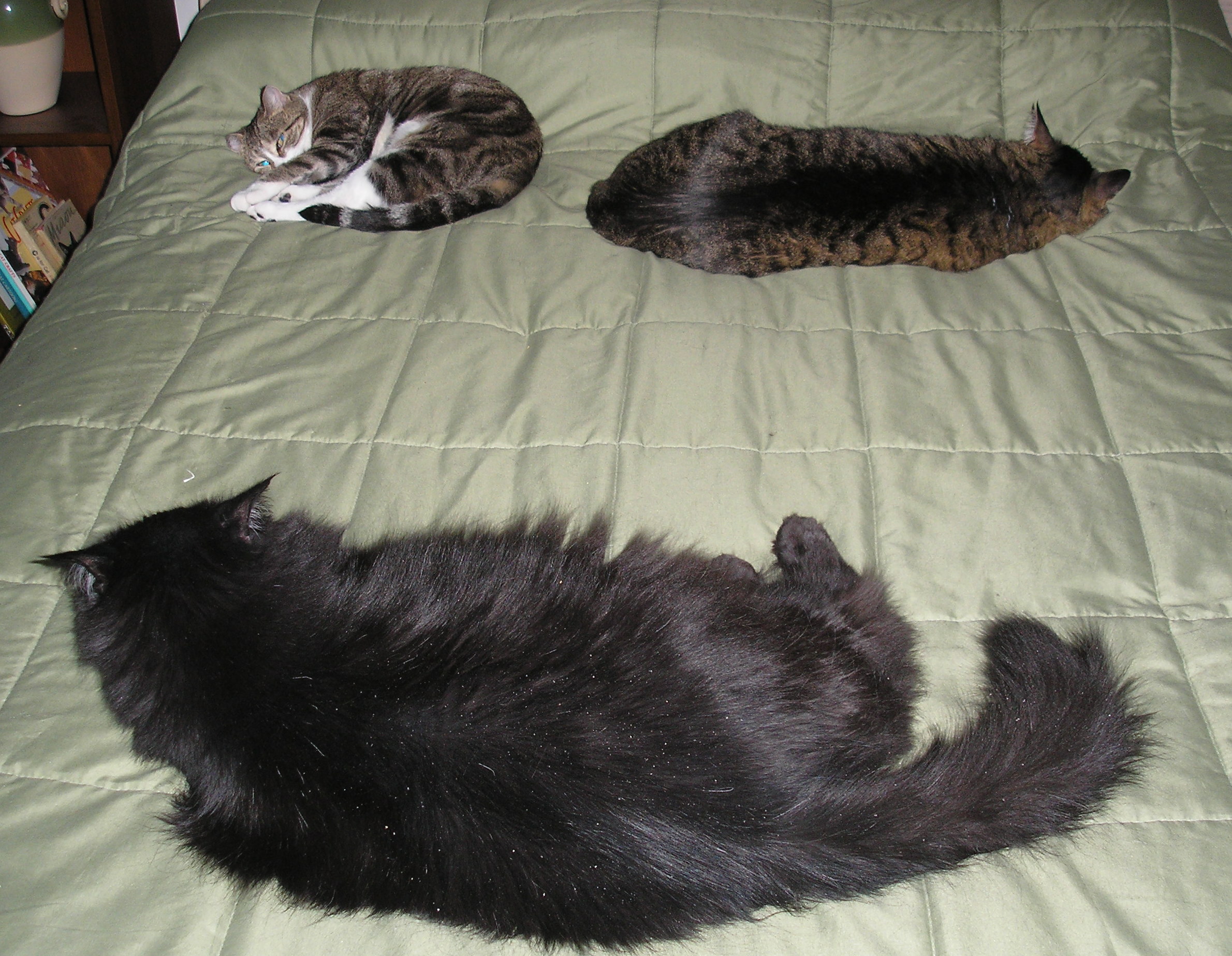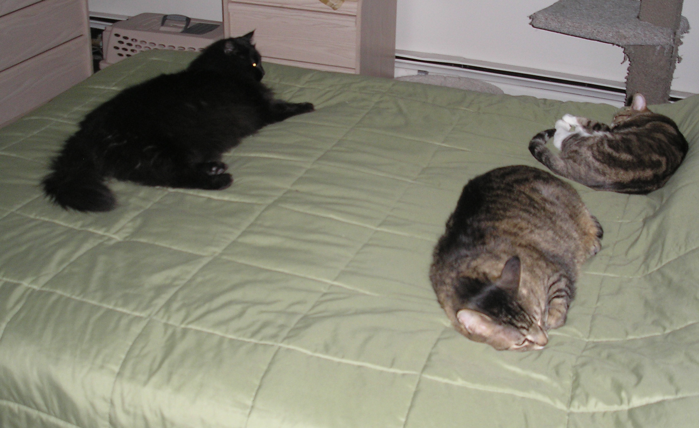 Zoe is happy to chase either Oscar or Cole - Cole runs up to the top of the cat tree in the living room. It's good for them to have a feisty little sis!