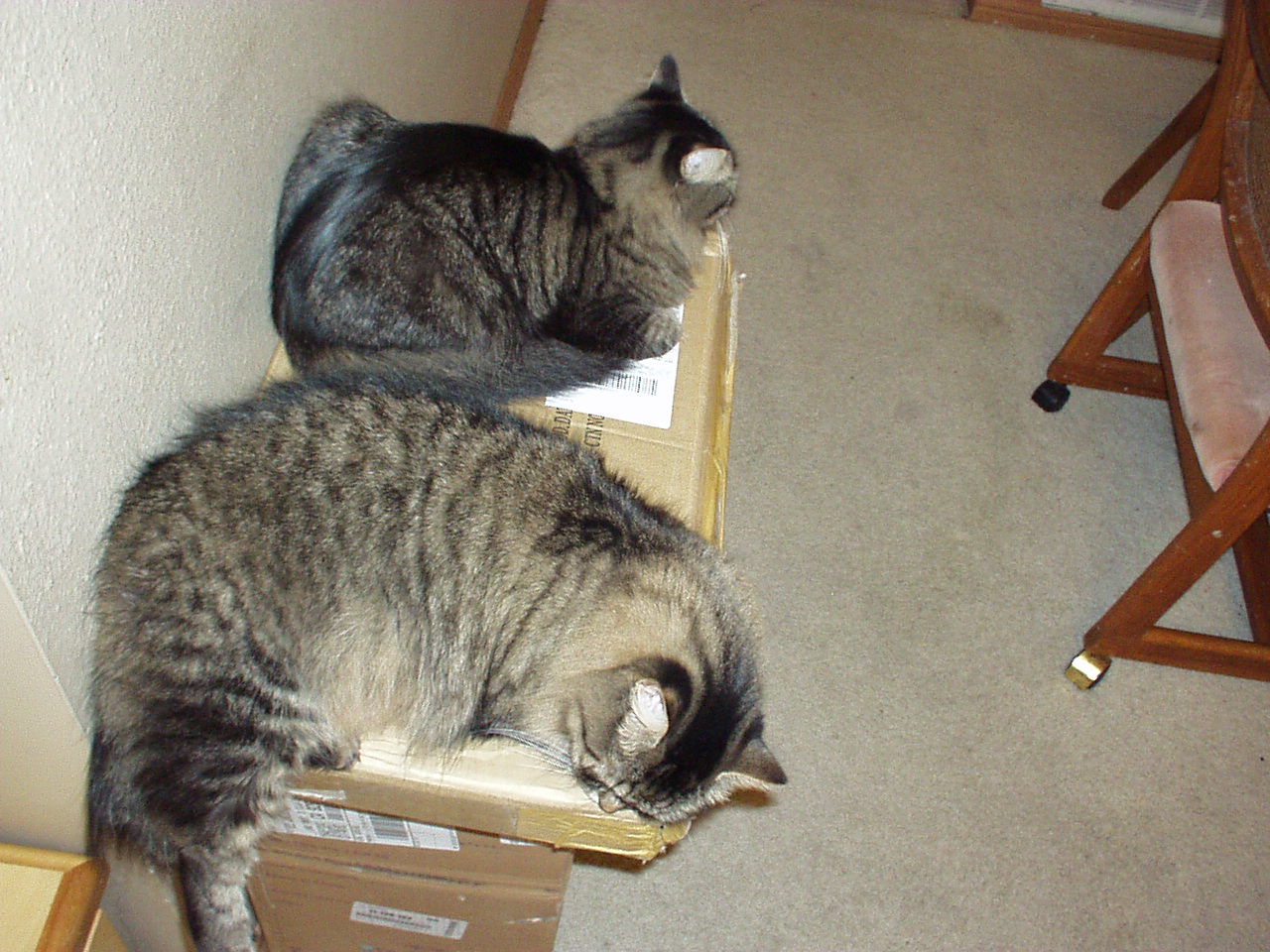 There were three packages on the floor, and Princess and Duchess were resting on them. More....