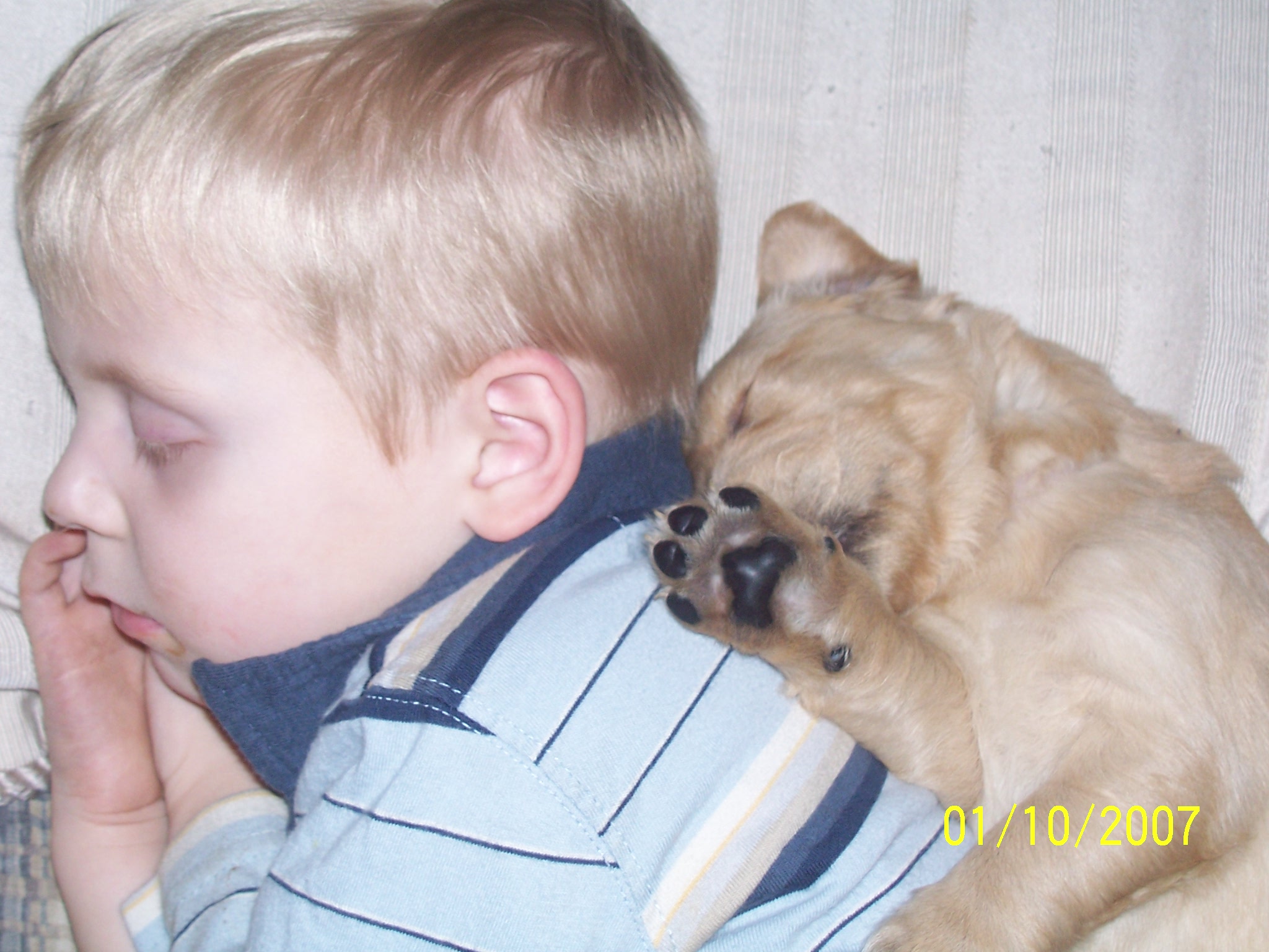 here is a few pics of 2 of the puppies sleeping with my son!