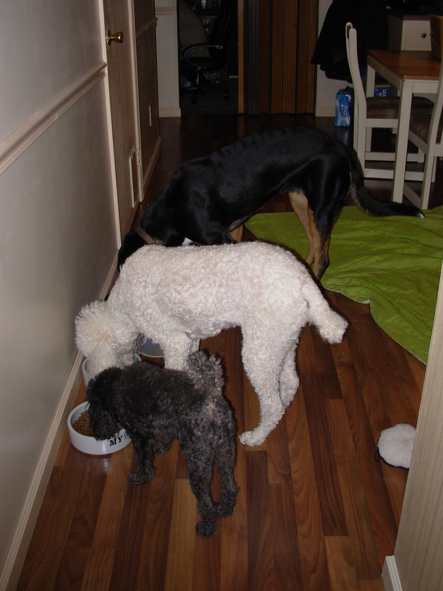 Mealtimes were uneventful. As you can see all three chowed down quite happily together. Harlee eats different food than Bella and Ripley and, of course, everyone wanted to try each other's food.Here are a few pictures. I hope you enjoy.