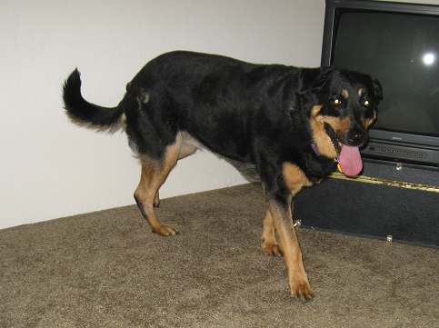 Trixie is about 6 years old. She's a spayed, UTD, half GSD/half Rottweiler. She is currently on Rimadyl. She weighs approximately 120 lbs.
