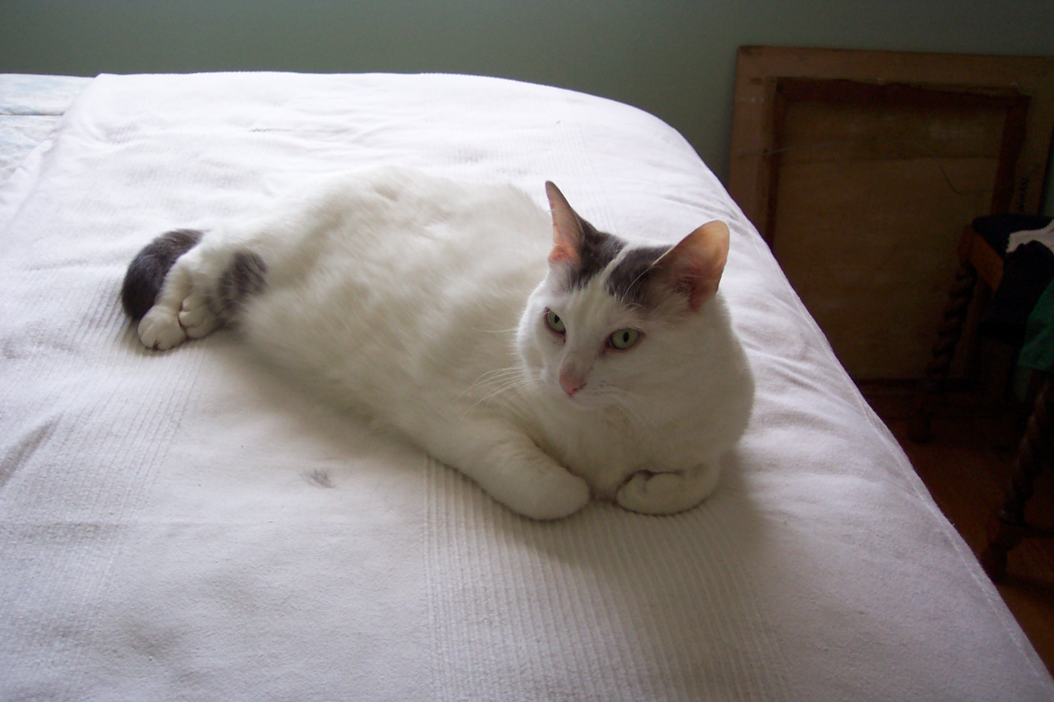 The cats are: Casper (HUGE white male cat, not deaf, with one blue eye and one green eye), Sid (short for Obsidian who is male) the black lounge lizard cutie pie, Orlando female, white with a grey ringed tail and an "O" on the back of her neck (and who chose to hide behind the washing machine for a while when we moved), Blaze, a female orange tabby with white feet who likes to sit like a rabbit and pretend scratch any surface to get attention, lol, Tippy, male buff tabby with a white tip on his tail -- another BIG boy lol, and Sophie, my female part maine coon fluffy mess (dim as a post, but beautiful as a supermodel).