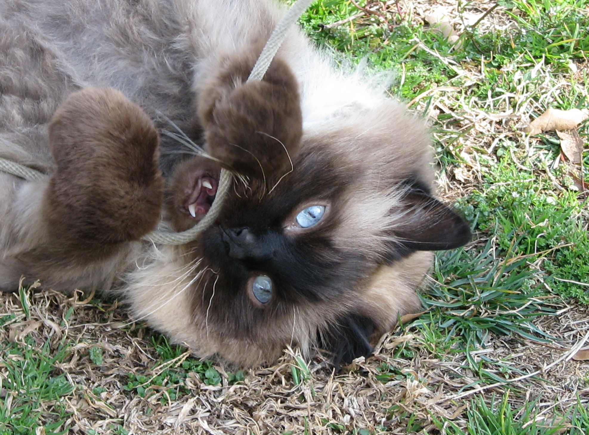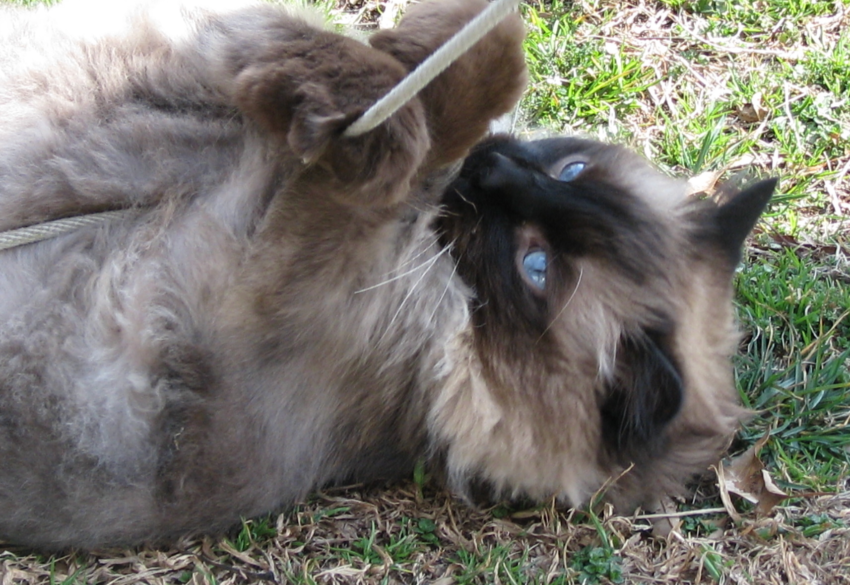Hello, My Luke doesnt play often. However, recently he became enthralled with the rope/ leash I use with LilGirl. Luke was so cute on his back playing with the rope. In the last pic are my three babies. I couldnt get all three to look in the same direction. I tried & tried & this was the best I got... Kay in NC