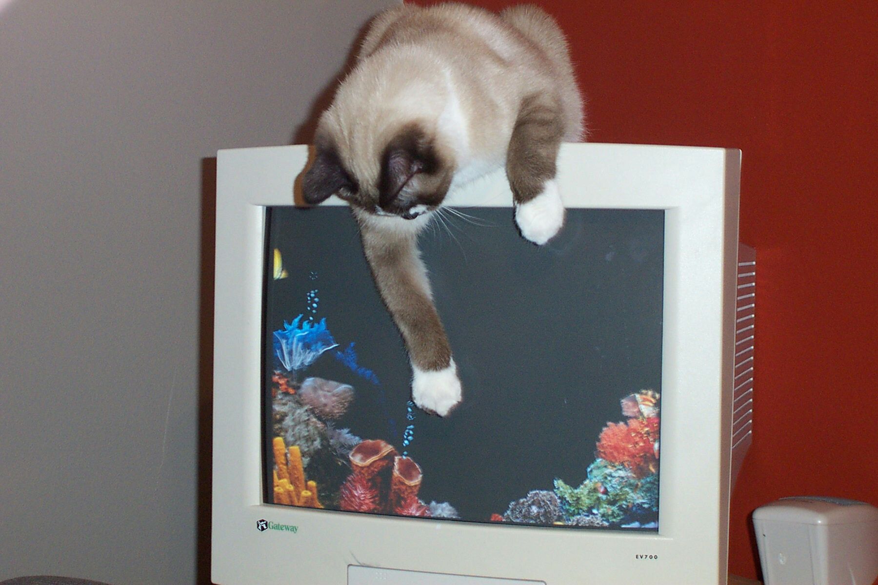 That's cute -- trust a kitty to look for fish regardless of whether they're in a fish tank or in a computer!
