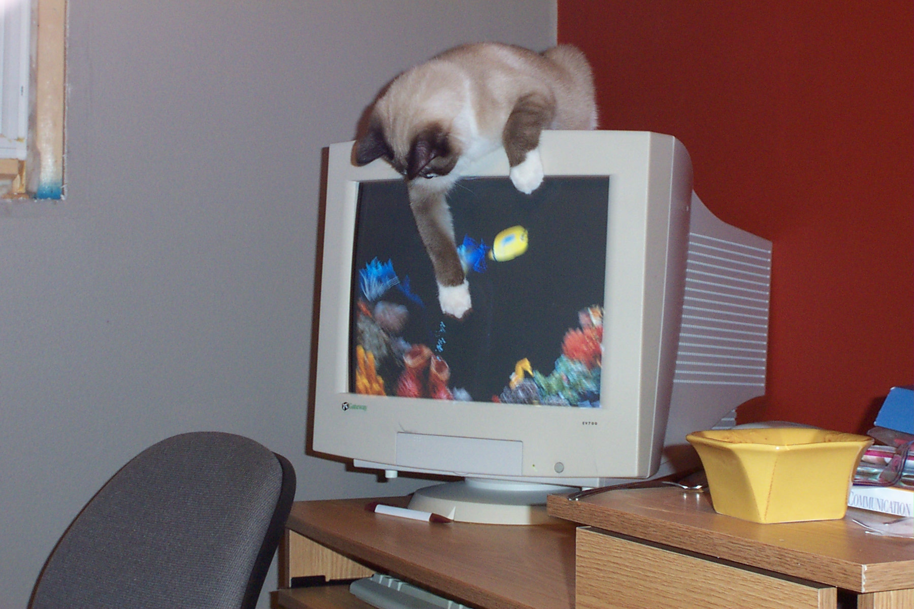 That's cute -- trust a kitty to look for fish regardless of whether they're in a fish tank or in a computer!