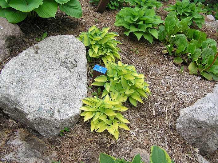 I'm personally a big hosta fan. I love getting different varieties and planting them together, it can be as pretty as blooming plants and they look better and better every year. We have some gold-leafed, variegated, and large blue leaved hostas together to make a great medley. I'll throw in a few pictures I took at a greenhouse lately who has a lot of pretty ones planted. We have a lot in our yard as well but I haven't gotten recent pictures of them (which I need to do). Hostas do bloom but they are planted for their foliage as their blooms aren't particularly impressive.
