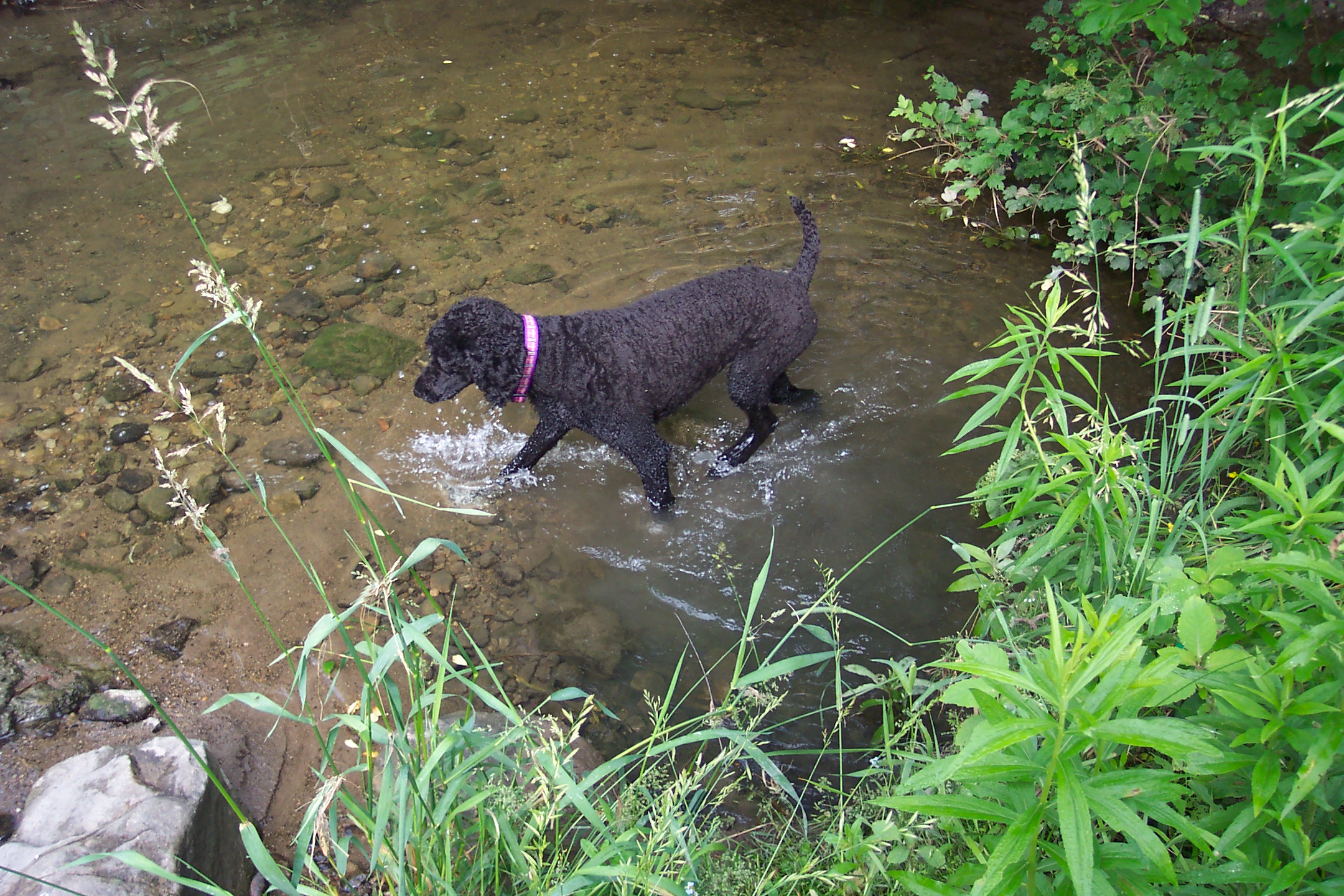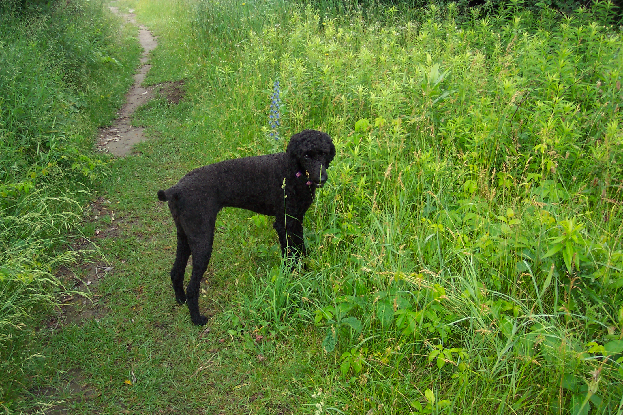 Here are recent photos of Bodea. She met a cute little eight week old Yorkie-Poo pup on the weekend. She was dancing around and he was a little ankle biter, but they both had a grand time and wore each other out! The little fellow thought Bodea was his mom and tried to nurse. Bodea was having none of that, LOL. Also a photo of Bodea on a new walking route we have these days. Enjoy and thanks for looking!![]()
