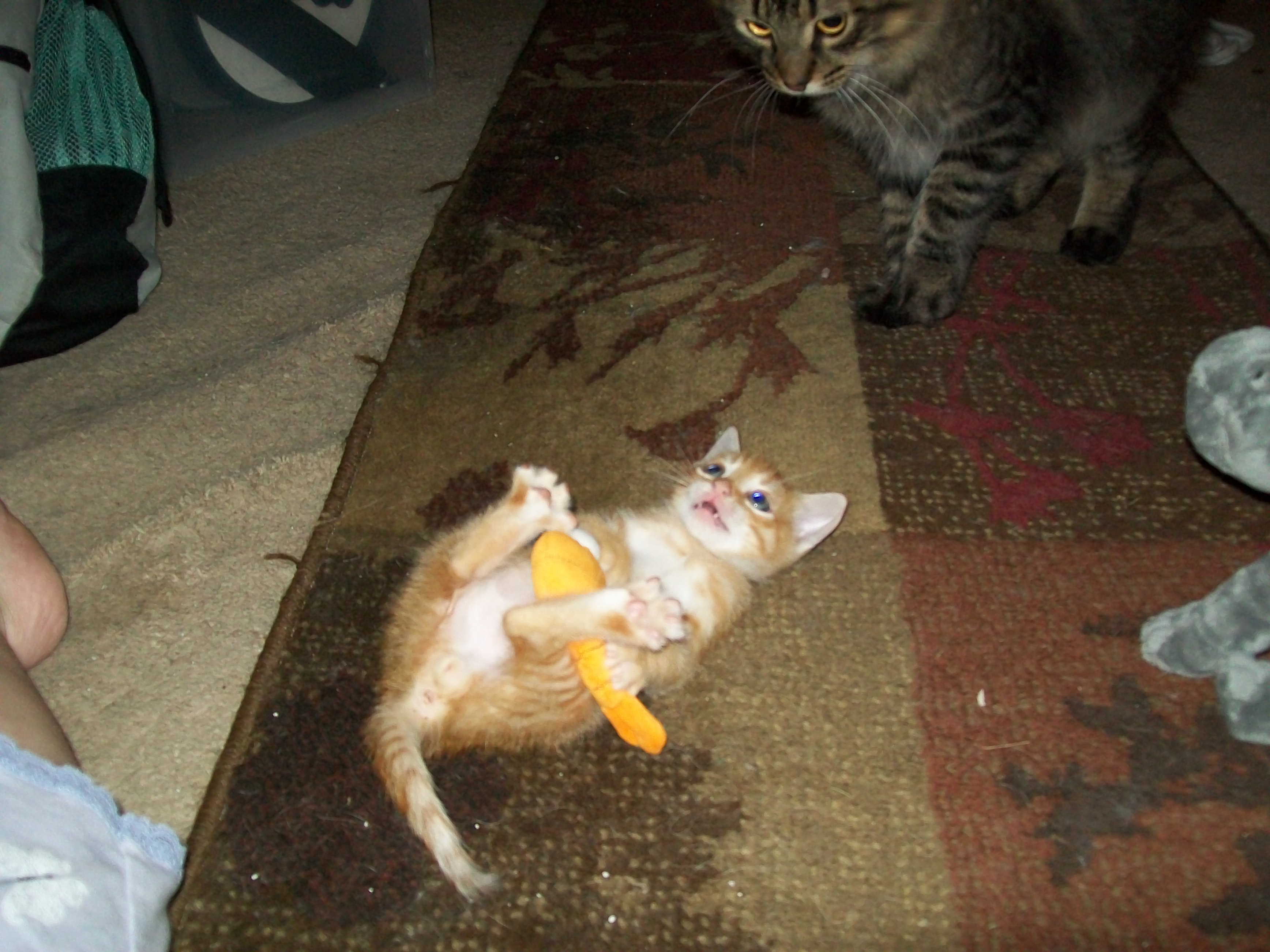 He reminds me some of my little orange girl Sparkler (see below), whose BACK legs are both cockeyed. She zips around just fine, though.