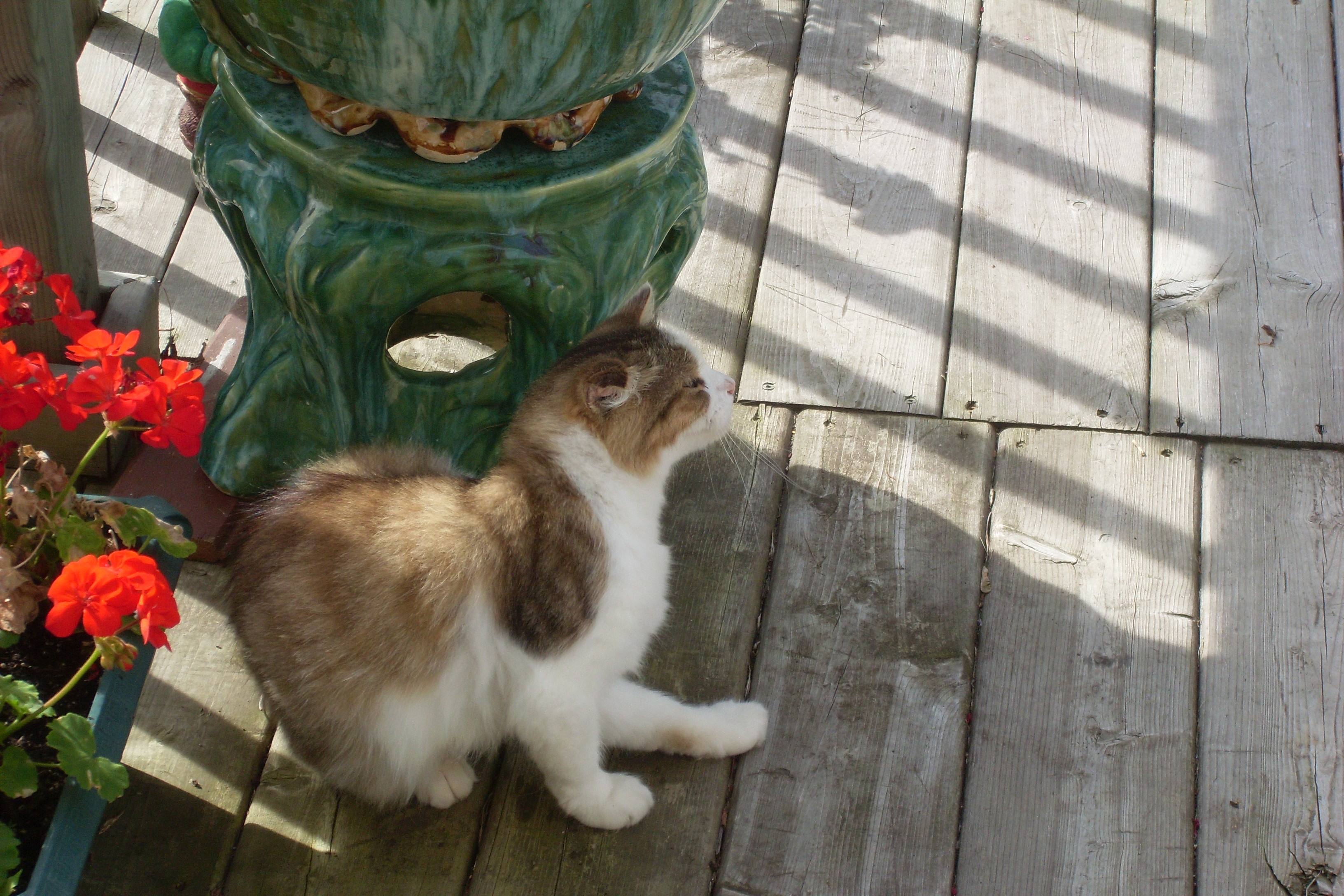 Most of them I know from previous times, are my neighbour's barn cats but one little girl seems to have adopted us as her own.I have to ask around and see if she has another home. She is only small and about one year old but unfortunately she looks to be pregnant and is constantly hungry ---I have been feeding her around three times a day ! She is very shy and won't come inside the house but she sits by the door , on the deck and watches us for hours. I have been able to pet her just once and she also lets my husband touch her on her nose very gently sometimes but I am sure she will get tamer as time passes..