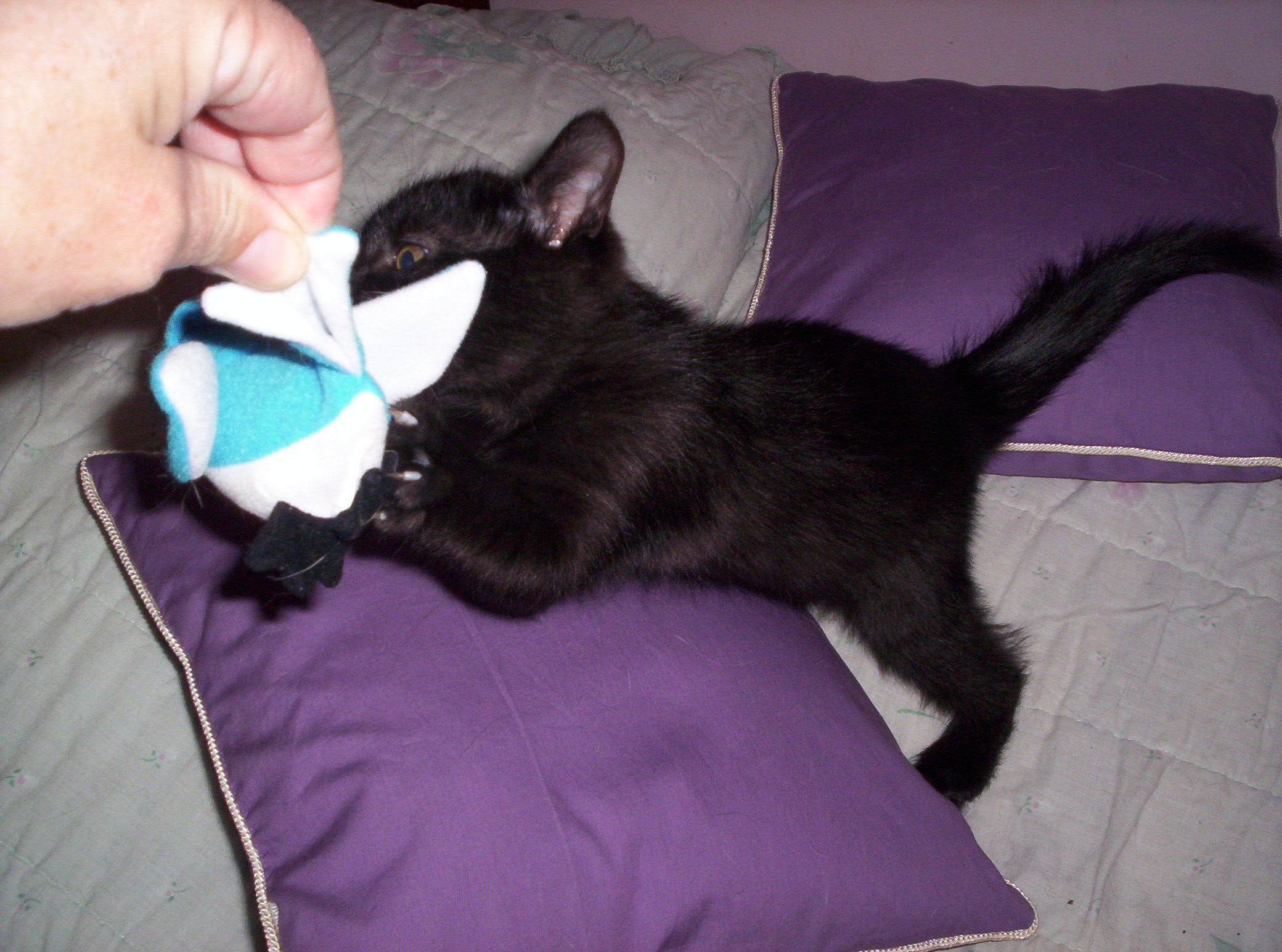 One kitty is all black (though he may be more dark smokey when he's bigger) and I was thinking of Onyx for him (calling him Nyx for short). He is a go getter, cutie pie.