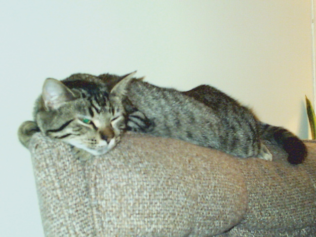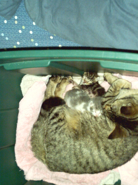 I rescued a kitten not long ago at the request of my landlord. She told me Zilla was a he, but a few days later I looked and he was a she. 2 months later I had suspitions she was preggy, but she wasns't showing, but one evening dozing off on the couch with Zilla by my side she gives birth to 2 beautiful kittens, Zorro(blk one) and Zena(grey,tan).