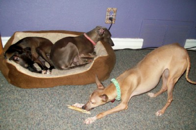 The two IGs that I have in my house, Crystal and Jewel, are making progess. Crystal has gained some weight and no longer looks like a walking skeleton. She is still not using the dog door, and still thinks the living room carpet is an excellent toilet, but we're working on it. Jewel has mastered the dog door and goes outside with the big kids. Yeah!