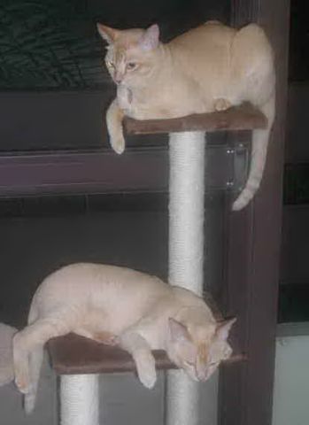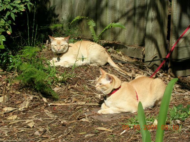 My older cat Cleo has never been one to crave the wide open spaces, very much the opposite. But when Colette was a youngster she would climb onto the kitchen windowsill, from there a jump onto the pergola then up onto the roof, and stand on the ridge of the roof looking down at me going "Nah nah na-na nah you can't catch me!" All this while I was sitting in the garden with them both and I thought she was safely lying beside me - here one second gone the next. She would even slip out of her harness when I had her on a long running lead and do it![]()