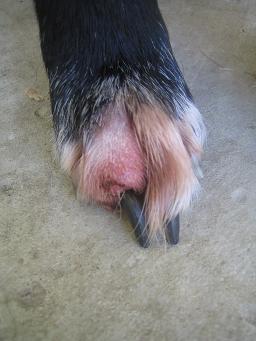 ... apparently while playing frizbee by the lake, I think he must've caught a nail in some of the brush. I noticed him licking his paw and he hasn't had allergies this year (probably due to Raw) but they usually do spark up in the Summer. I assumed he had maybe been licking/chewing excessively because there was some dry blood around the digit. So I called the Vet and got an appointment for today. I was looking more closely yesterday, and I realized his nail was crooked on that toe, and there was puss coming out, and it was swollen to twice the size it was supposed to be.