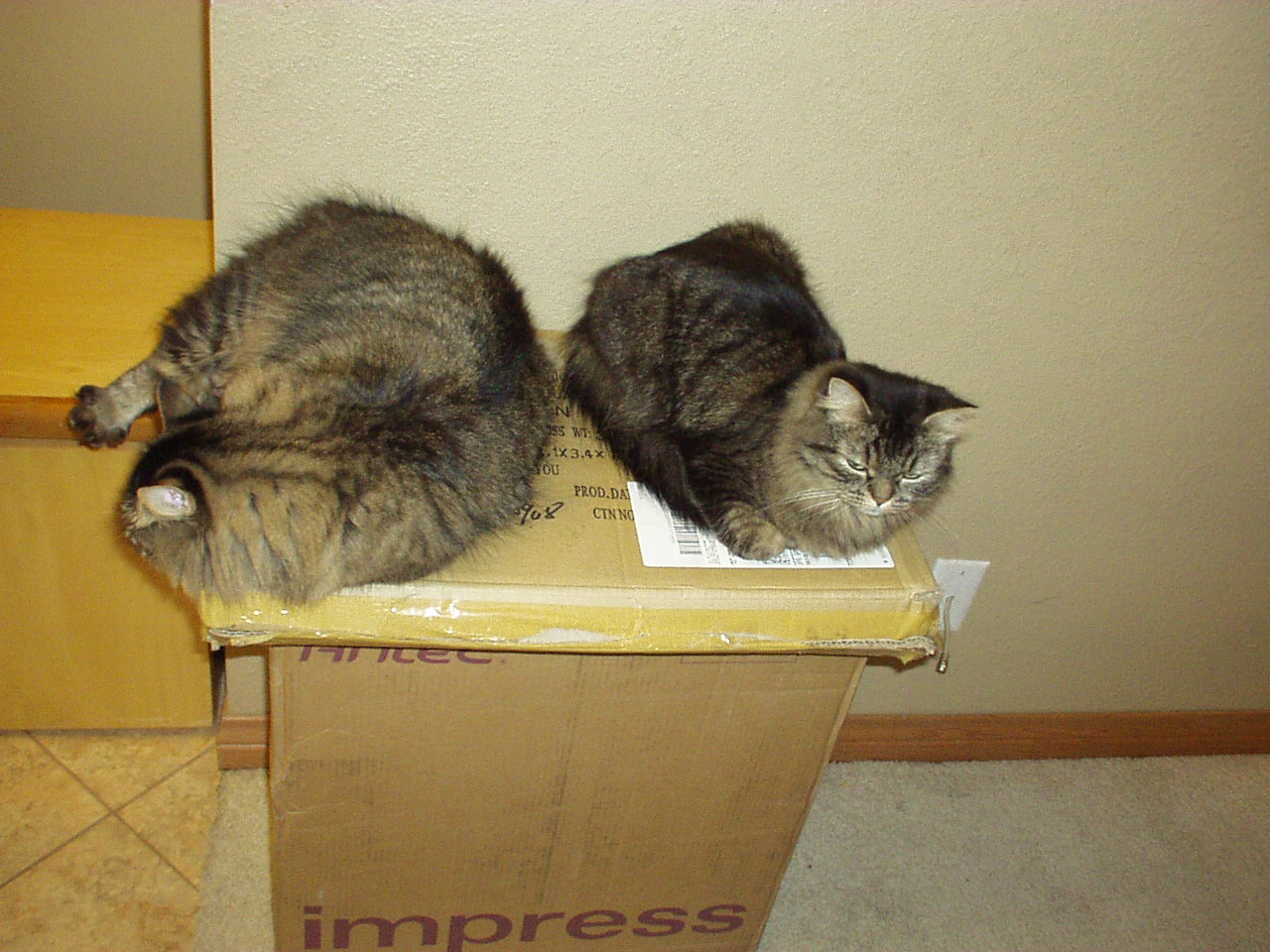 There were three packages on the floor, and Princess and Duchess were resting on them. More....