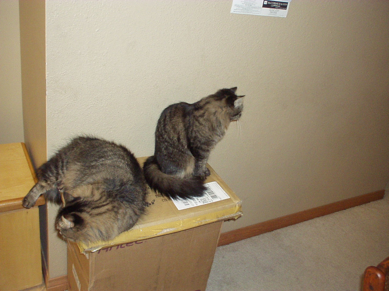 There were three packages on the floor, and Princess and Duchess were resting on them. More....