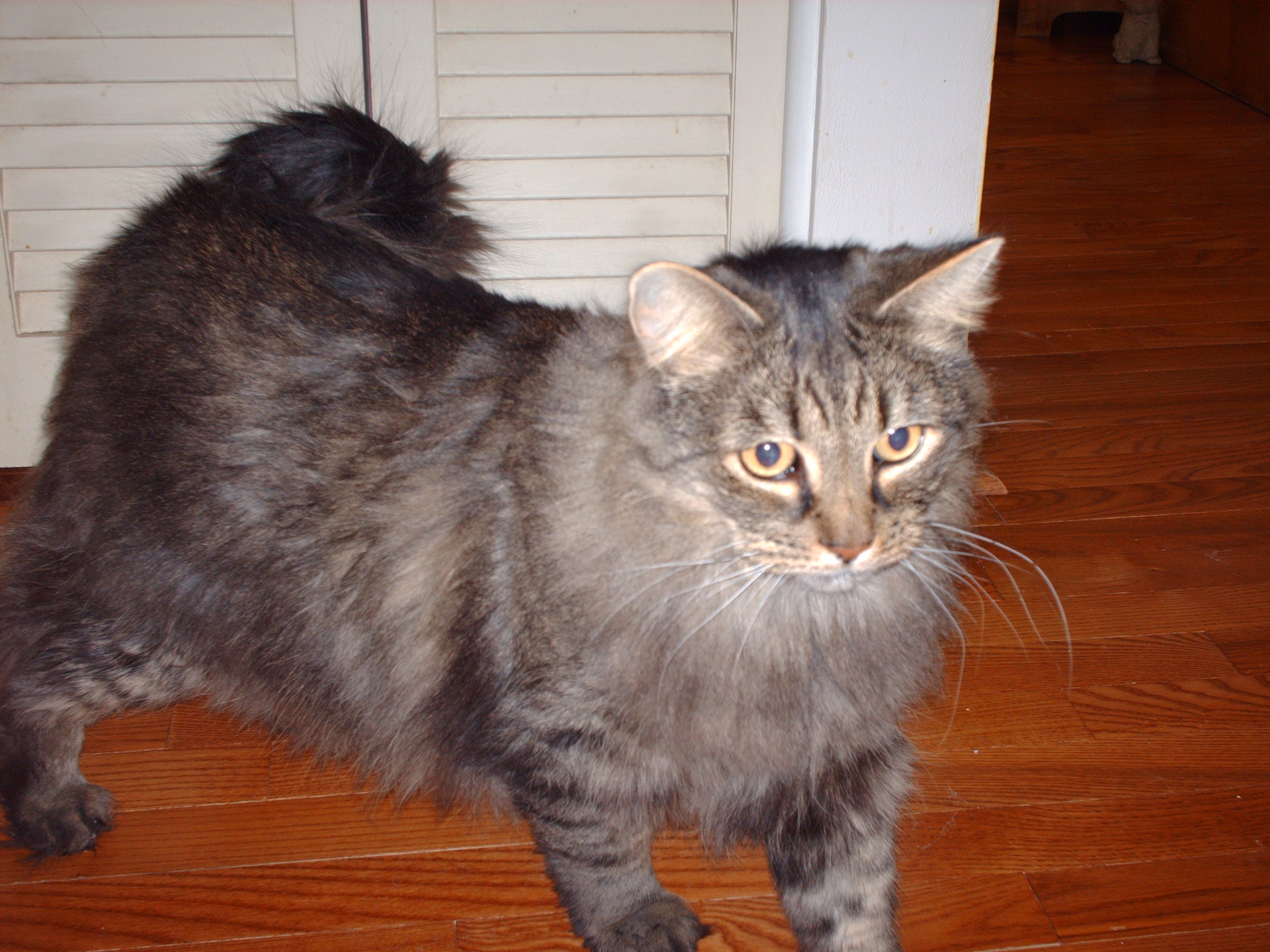 Pigeon was dumped in my yard (a driveby) when she was in labor! Her kittens were premature and 2 were stillborn, the other she kept trying to smother, I guess because she knew it wouldn't make it anyhow. They were so premature, you could see all of their insides. My vet had me make a formula and feed the kitten w/a baby doll bottle but the little sweetie died anyhow. I later found out that Pidge was a farm cat who used to get kicked in the head by the farmer who wore big boots. (I often wondered why she would never let any of us stroke her head. She does now but it took a lot of years.) After she gave birth, I somehow instinctively knew to just hold her while I sat out in the sun. She'd turn her face upwards like a sun worshipper, sweet thing, as though this was the first pleasure she ever had. And she had every worm, tic, flea, bug, mite, you name it, everything except the fatal illnesses, thank goodness. She's my sweetest tempered of all the cats and she's the first one I introduced Puddy to. Puddy was her usual rambunctious self and Pidge just put her huge paw on Puddy's head and held it to the floor until she calmed down, as if to say "Chill, youngun." It was hilarious to watch!