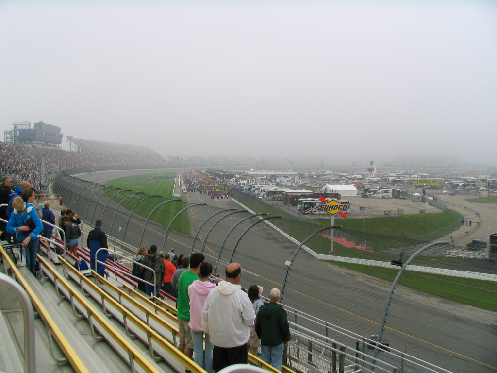 Lap 11 -- RED FLAG:The cars are hitting pit road as the spotters and NASCAR officials can't see the whole track due to fog. Teams are not allowed to work on the cars and the drivers will remain behind the wheel.