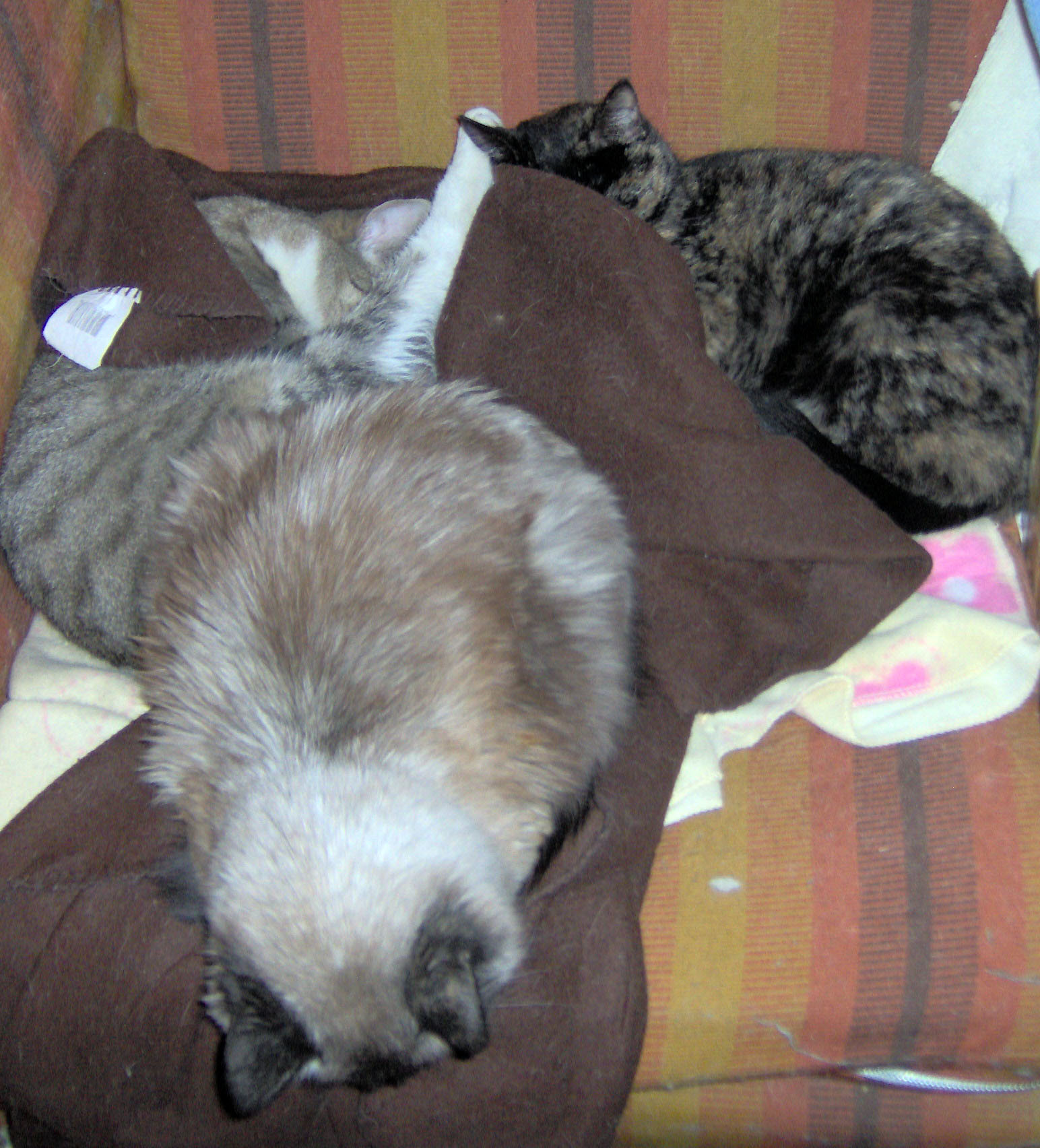 Congrats Jen that is one great pile, but I think you missed 1, I count 15. Got too love it, when there's a storm coming the pile begins. I think the most we've had is about 12. They give you the look as if to say OUR BED you go sleep in the chair. In our house that’s not so easy as you can see. This is the only pile picture I have. It seems that as soon as I get the flash box they scatter. Sorry about the shake, I was “runed over” by the escapees.