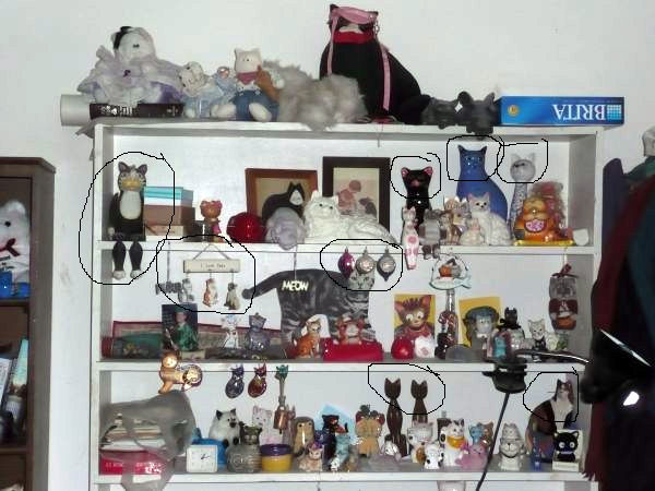 First collection, second shelf, spotted kitty in the middle and grey cat, same shelf, all the way on the right. Glass shelf collection, right side, kitty with dark brown face/legs and striped body. Second to last picture, the picture above the tall kitties, top shelf, blue or purple kitty, second shelf, the grey kitty with the pink ears and the brown one next to it.