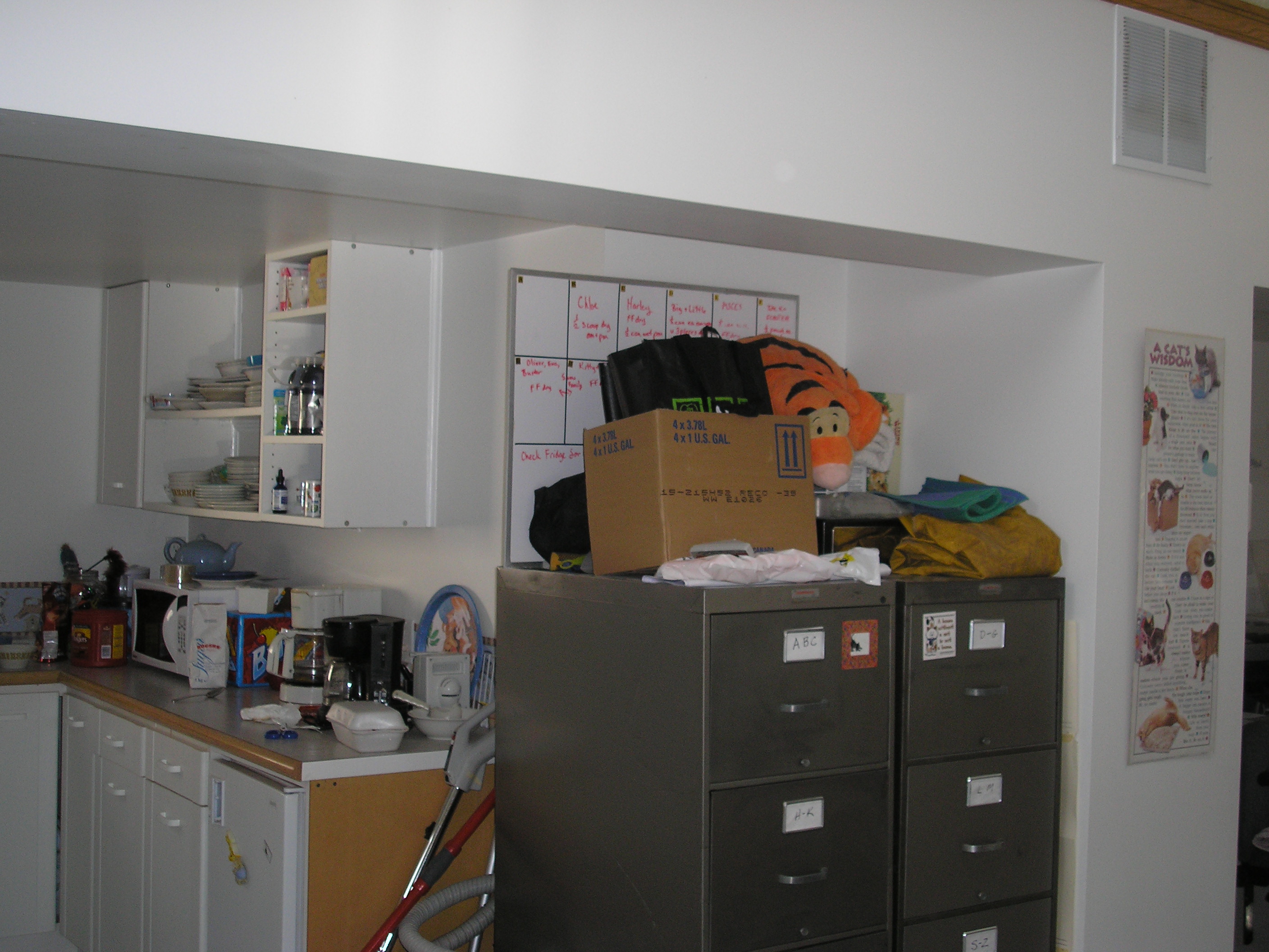 NB - the dishes are as they were on Tuesday; also, the used room broom upstairs on the ledge has been there since Tuesday; none of the litter boxes or scoops have been cleaned. I was stunned to find out that the place has run out of the sanitizer in which clean brooms, scoops and boxes were soaked for 15 minutes - and none has been ordered to replace it.