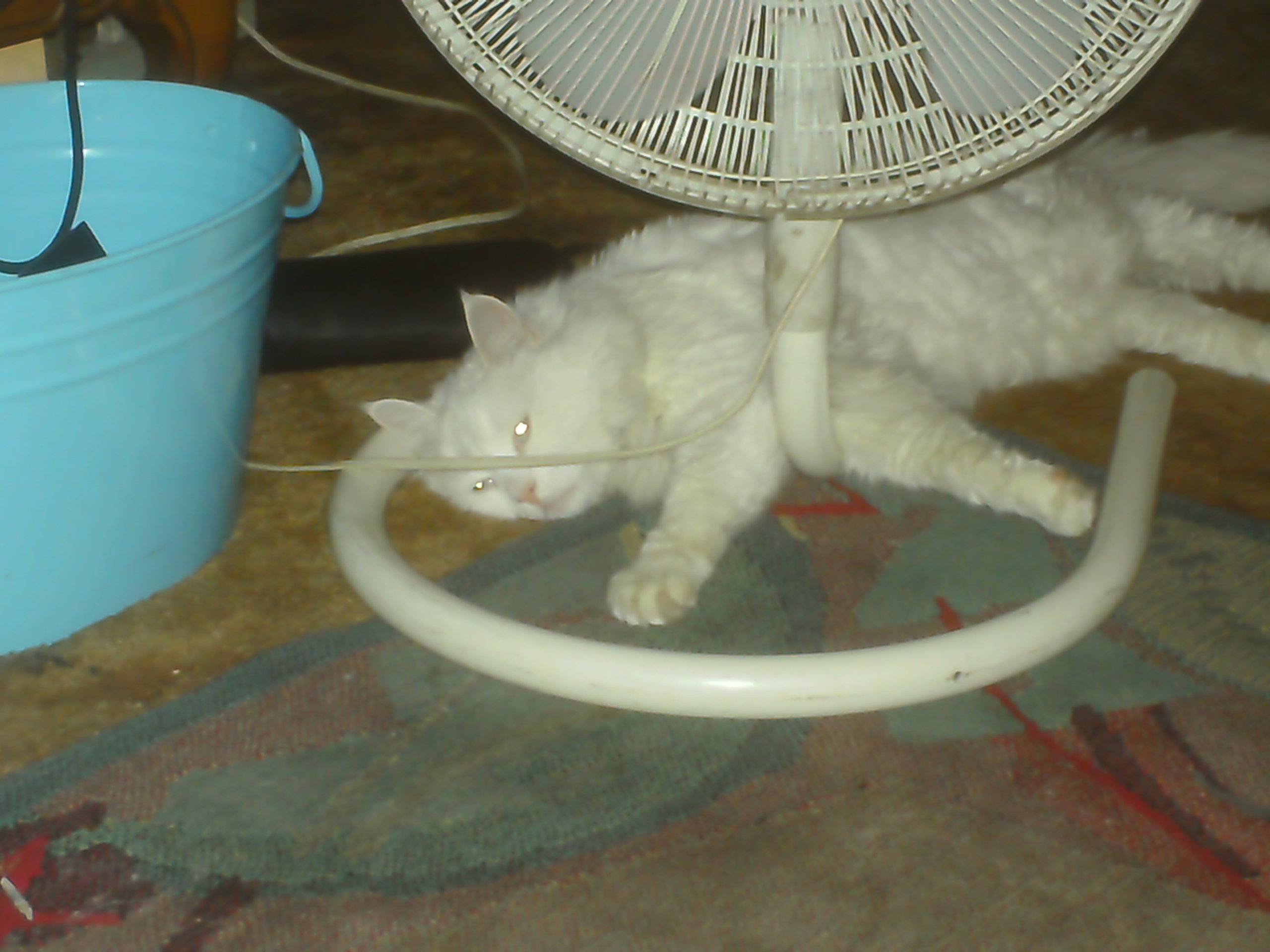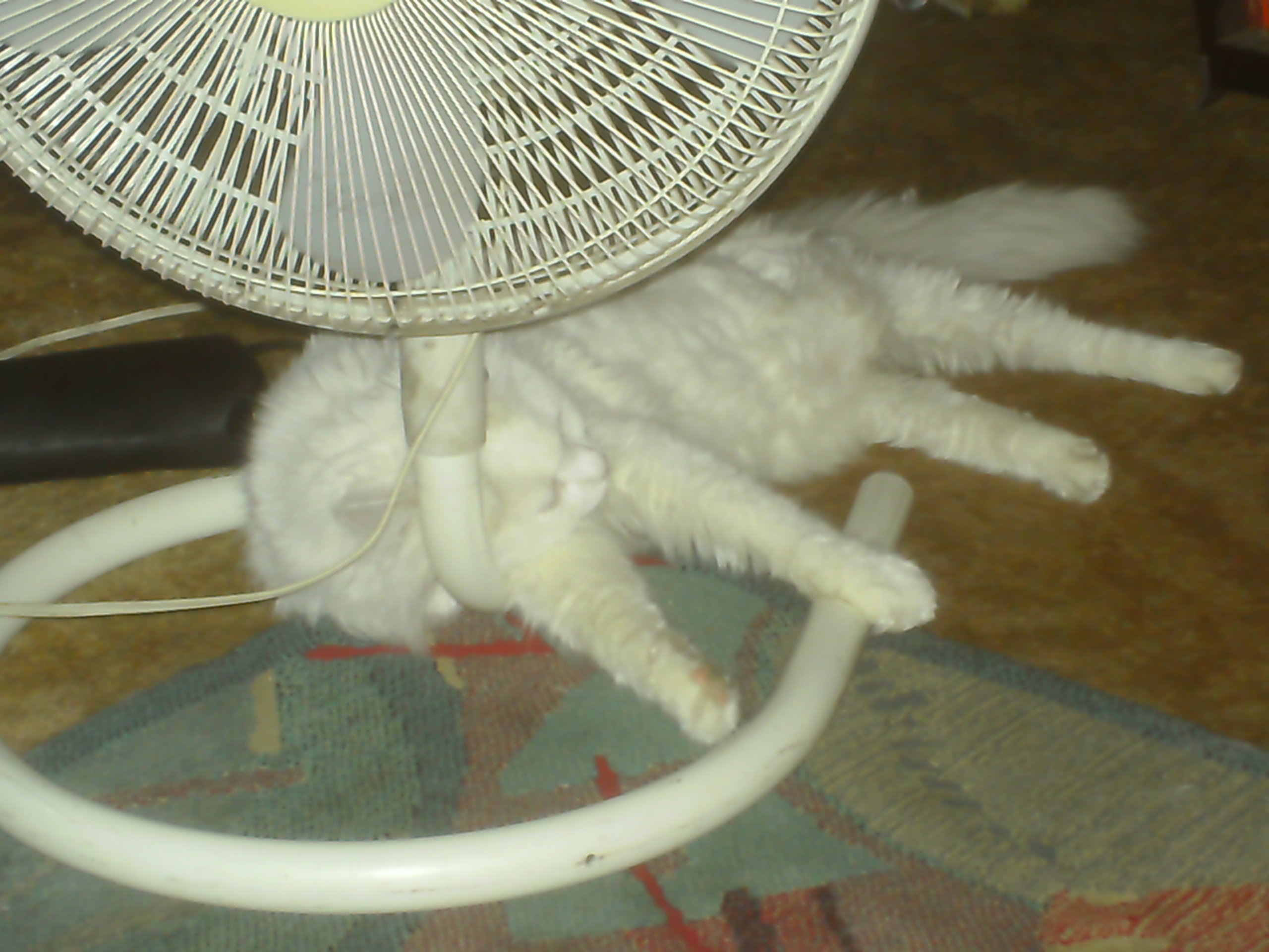 Lately he has picked up the habit of laying down in the base of the fan, while it runs!