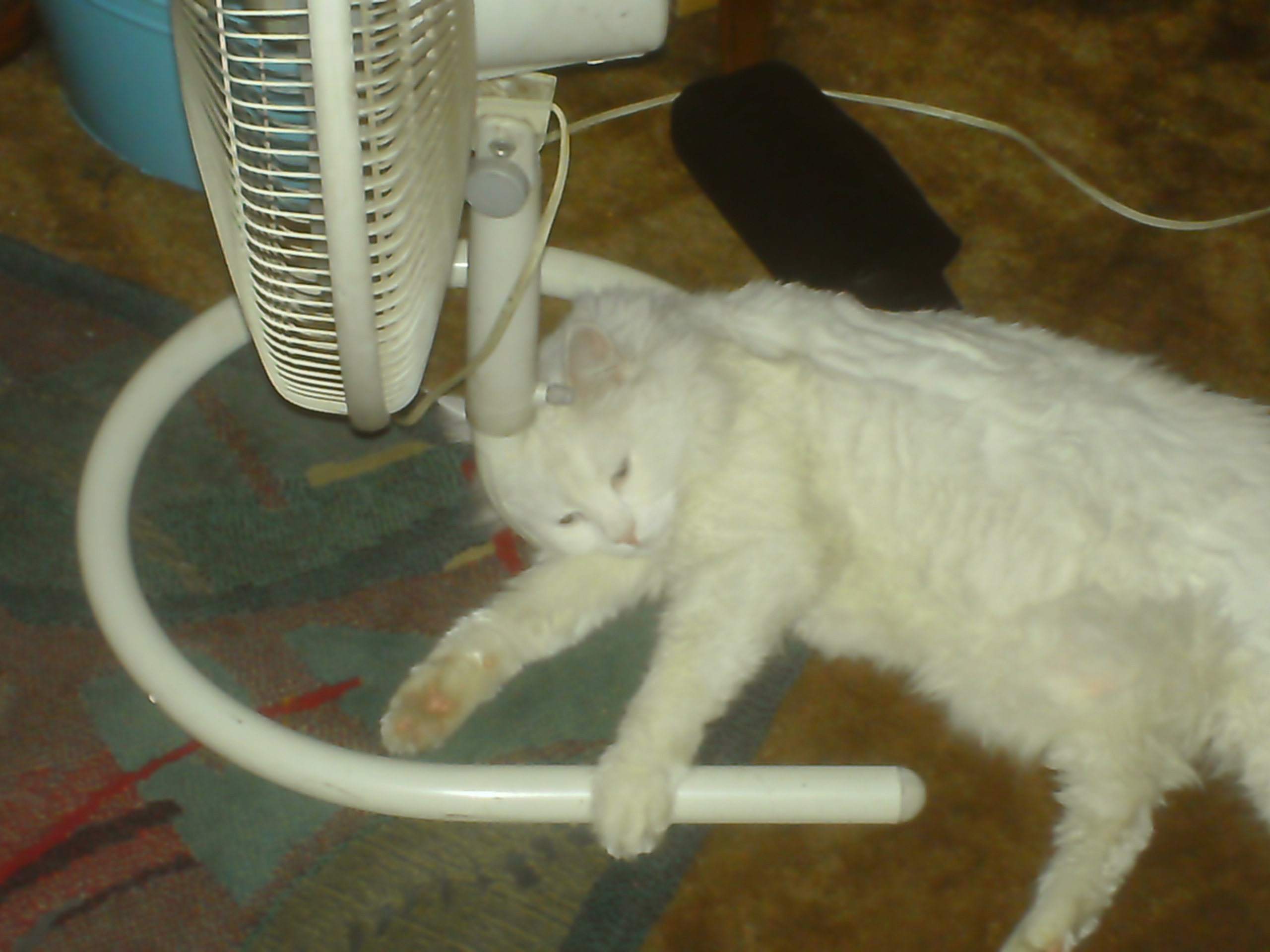I have a few tower fans and lately I've caught Sunny lying beneath them and this morning he had his head on the base of it. I wasn't fast enough to take a picture of it though.