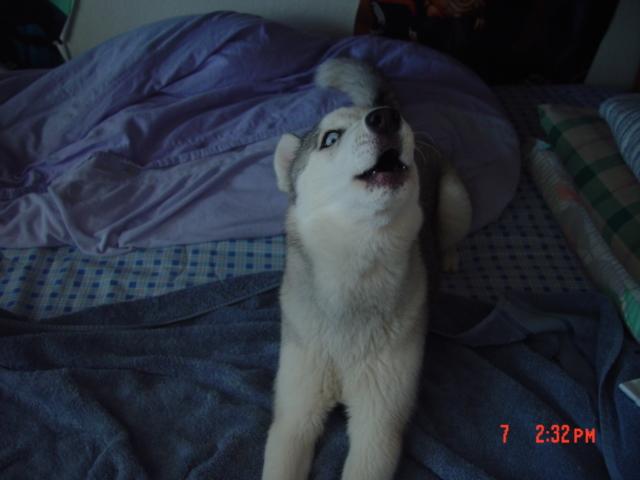Tikeyas dad was a wolly husky Grey and white with brown eyes, Tikeyas mom was a short coated white sibe with blue eyes.