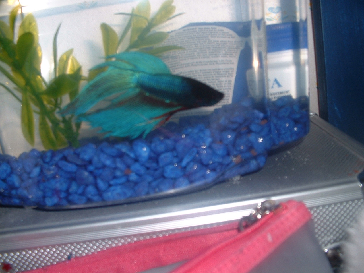 I got my betta in April this year. He is red with green which in some angles he is purple(he was a bit more purple there when I first got him). His name is Sexy, I named him when I was hyper,teehee. He's not so much of a tough betta, he usually doesn't puff out his gills. It's fun to watch him eat and swim around, he really likes my aquarium lamp which is right beside him and he always sleep in his fake plastic seaweed. I saw some pretty cool betta's at Ruffin's today, I really like the pearly ones with pink and green with blue fins I think their called opaque. I also saw a female one! I've never seen a female one for sale before! Once my Sexy goes down the toilet(hopefully that day doesn't come soon, I love my Sexy) I am going to get an opaque one. I had a mino I caught from the lake in with him and he just looked at it funny and kept swimming, it eventually died since you can't keep mino's in captivity, they die quickly anyway. Anyways here's a pic of my Sexy: