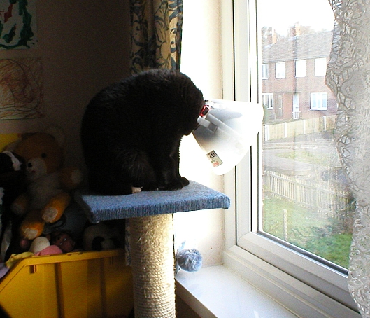 Aww, poor Ebby, that cone is HUGE! Poor you too. It's a bit stressful keeping an eye on a sneaky cat!