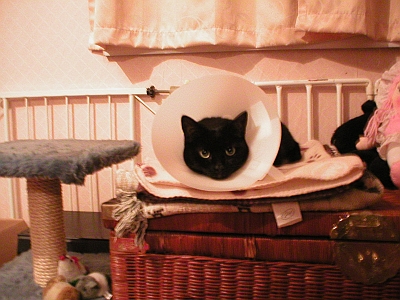 She is such a sneaky girl you see. The pattern so far is that she is nothing but innocence and calm until she is on her own, or during the night while I sleep ... take that back somewhat, she has got to the stitches while I've been around a couple of times. The cheekiest was this morning just after I helped her to the top of the cat tree! But if I say no in a loud voice, after glaring at me, she will stop.