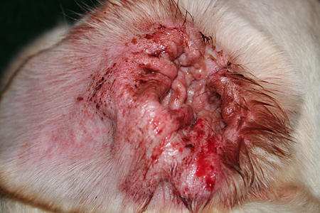 Nova has had an ear infection for a few days. It has really gotten bad. A minute ago she was scratching at it and then cryed. She made herself bleed really bad. I am in the midst of filling out paperwork to start homeopathic treatment but this can't wait another day or two until that vet can see us, so I'm taking her to our regular vet.