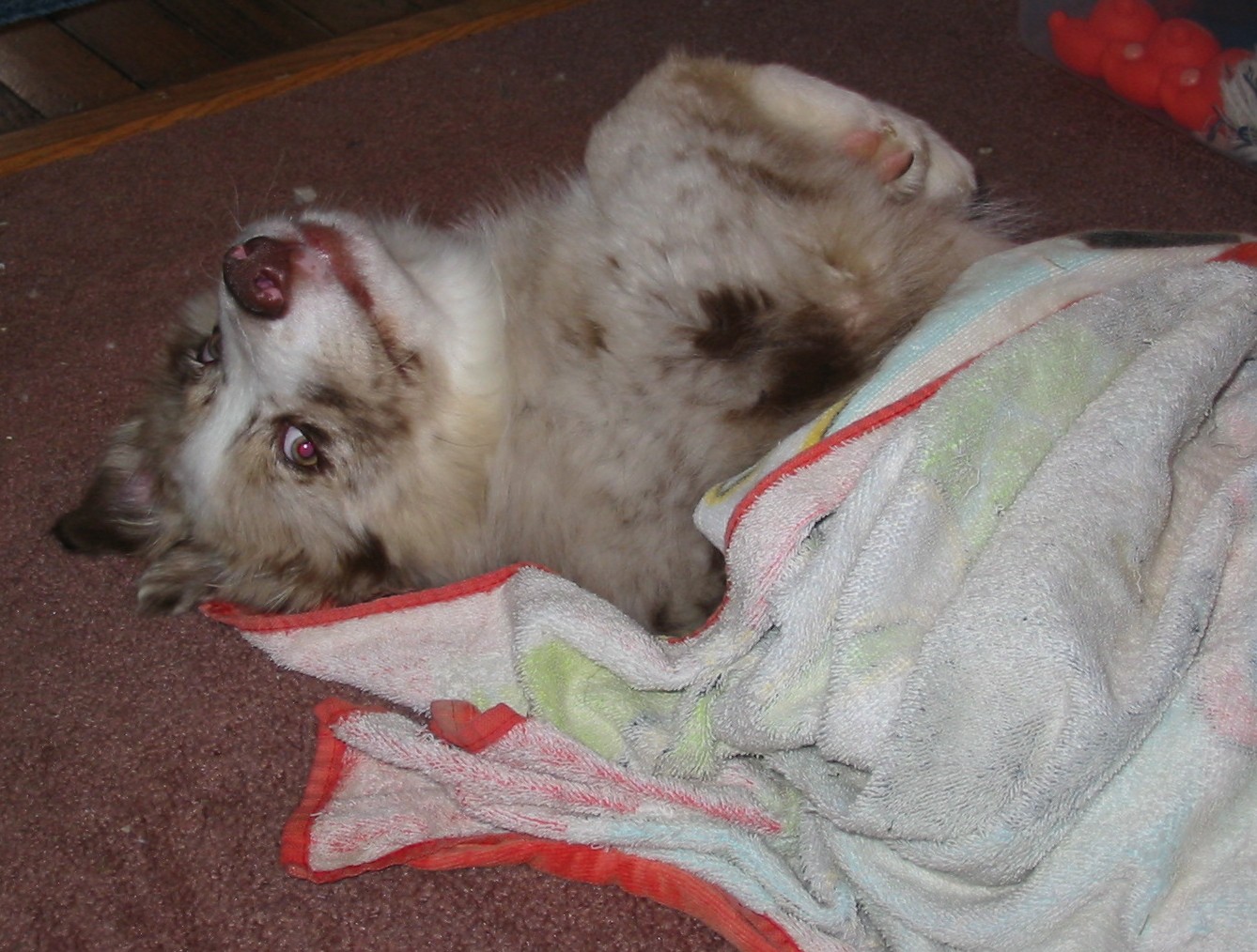 The one with the orange blankie is after a swim, he always rolls him self up in the towel. The second one he is laying on a pillos off the couch (since he isn't allowed on that sofa he just borrows the pillows!)