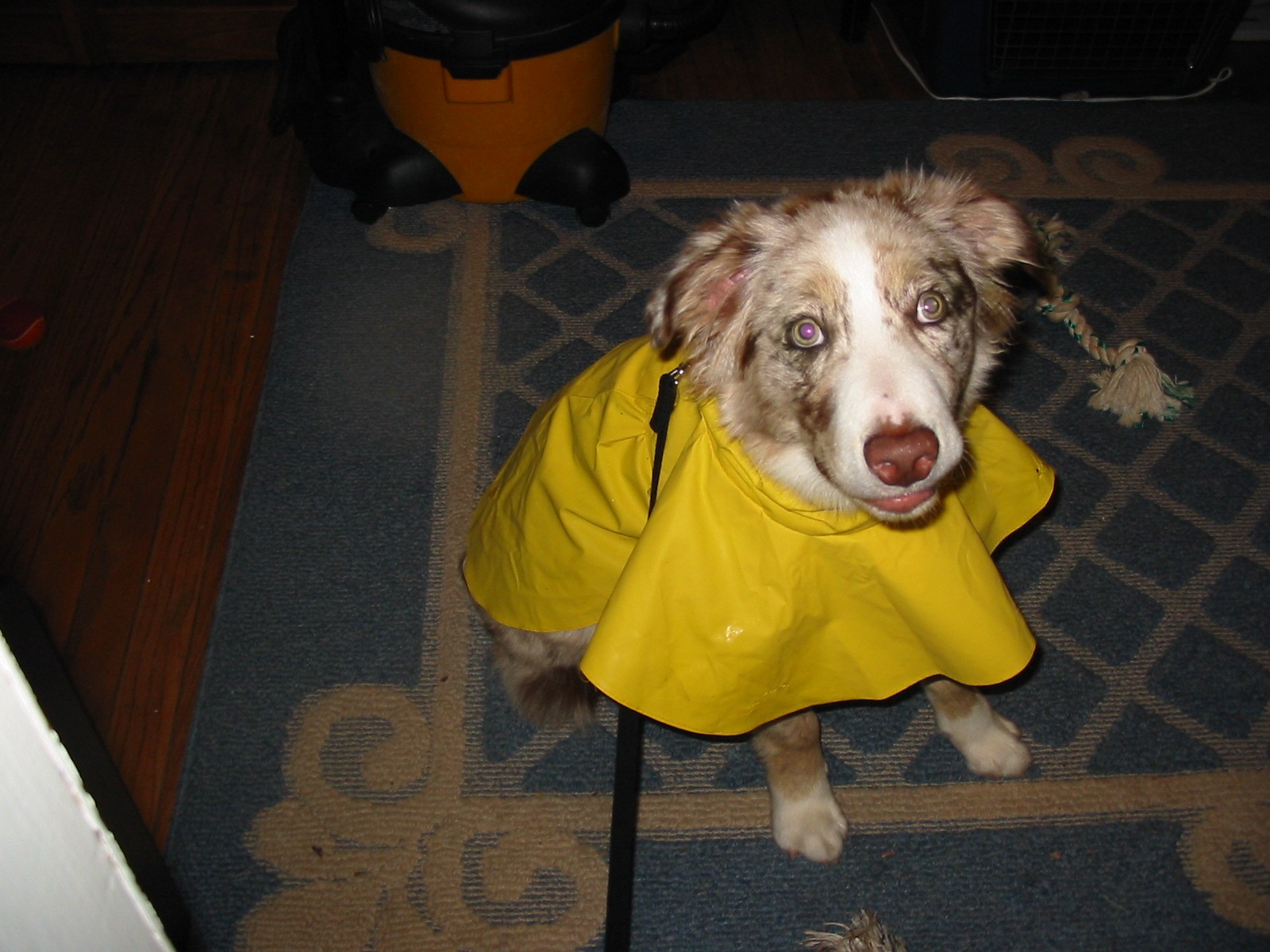 He looks so cute in his raincoat. You go have fun, Cochise; Ernesto can't stop you.