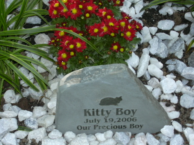 My poor little Kitty Boy- he had multiple myeloma and died a few months ago. It was heart-wrenching to take him to the vet and have him put to sleep, I don't care how many times I hear what a "kind, loving & humane" thing I did! It was awful! I had him for about 12 years and he was the most loving cat I've ever had. He had a personality that was unparalleled! He is sort of a legend throught my extended family, that is how unique & special he was. I work in a funeral home, so I had some resources.... and I had a funeral for him in my back yard, where we buried him. Sounds silly to some, I'm sure, but I cannot stress enough how much it helped me through the grieving process. I HIGHLY recommend it! He was buried in a baby casket, complete with a tiny casket spray on top. We lowered him into the ground and a dear clergy friend of mine volunteered his time and we had a brief service for him. It was really great! Kitty Boy deserved it, for sure.