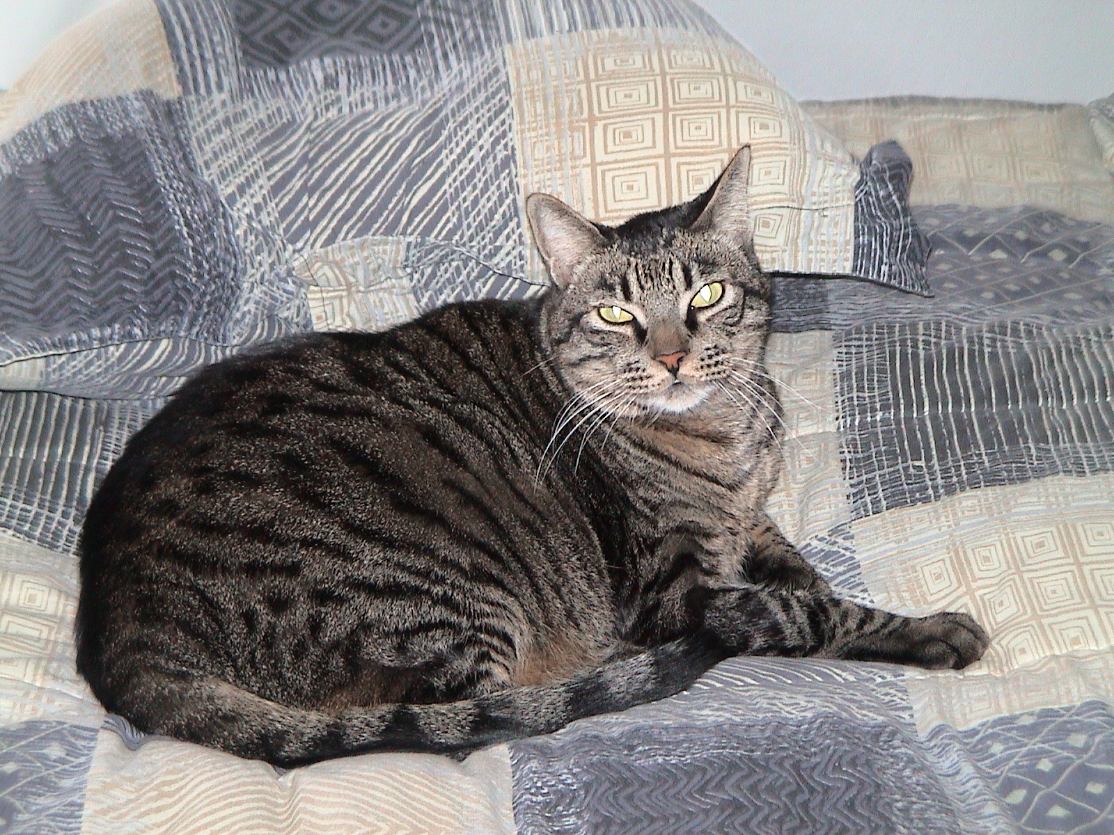 Taz is my "fat cat" that I have had since 1995, so I put his age to be about 11 years. I guess he is a Tabby cat. I got him from a family that loved him as much as I do, but couldn't keep him due to the fact that two of the family members were allergic to him. He has endured MANY moves with me over the past 11 years and has been a trooper with getting use to new homes and roommates pets. Usually for the first month or so he would hide under the covers on the bed. (attached photo of this)