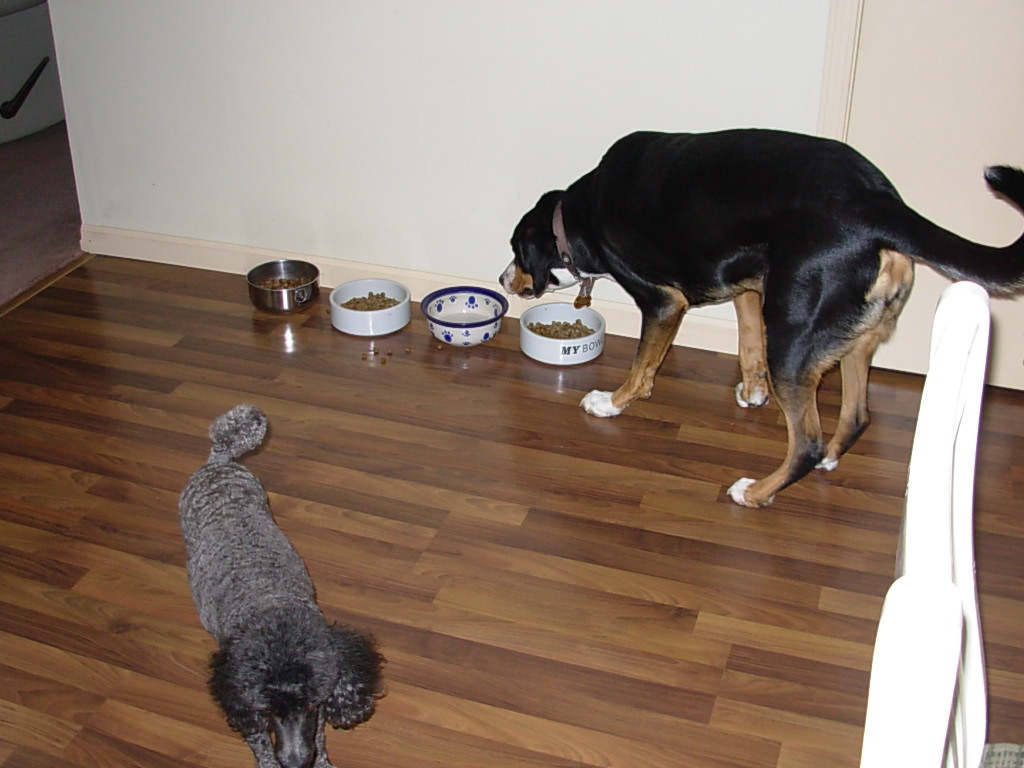 I took some pictures this morning of the dogs outside and then after they came in I got a couple more. As you can see, Harlee's appetite is still intact.